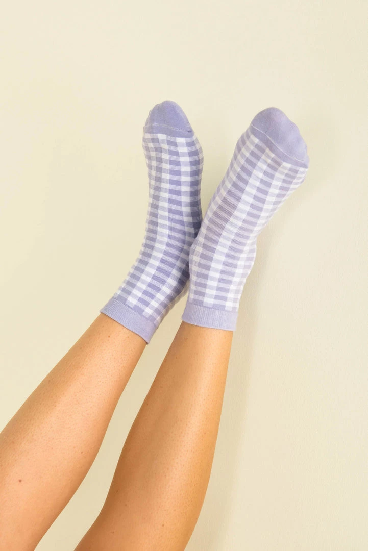 Cute socks are always a good idea! These adorable socks are made from a lilac and white gingham fabric in cotton. Style them with white sneakers and a summer dress!