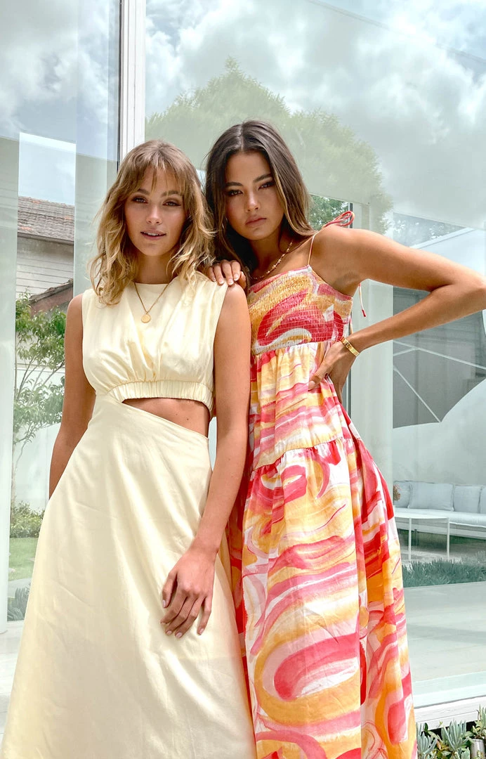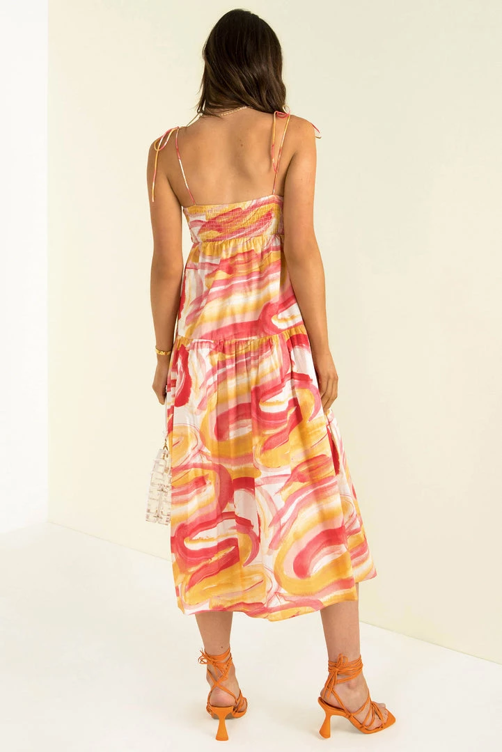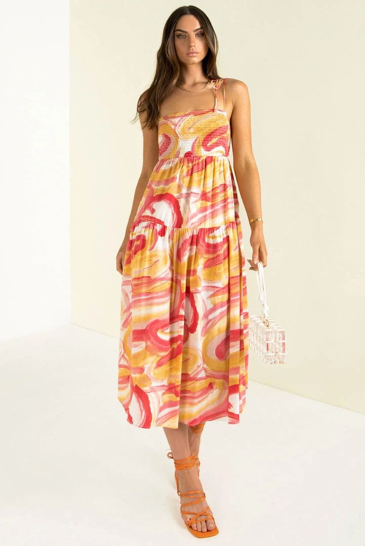 Our beautiful Adley Dress is perfect for all your weekend adventures! This gorgeous midi dress is made from a high-quality fabric in a pink and yellow swirl print. She features a shirred elastic bodice, tie-up shoulder straps and a full, mid-length skirt. Style her with gold hoops, a mini bag and mules.