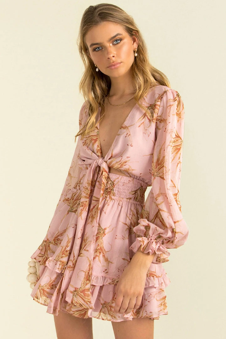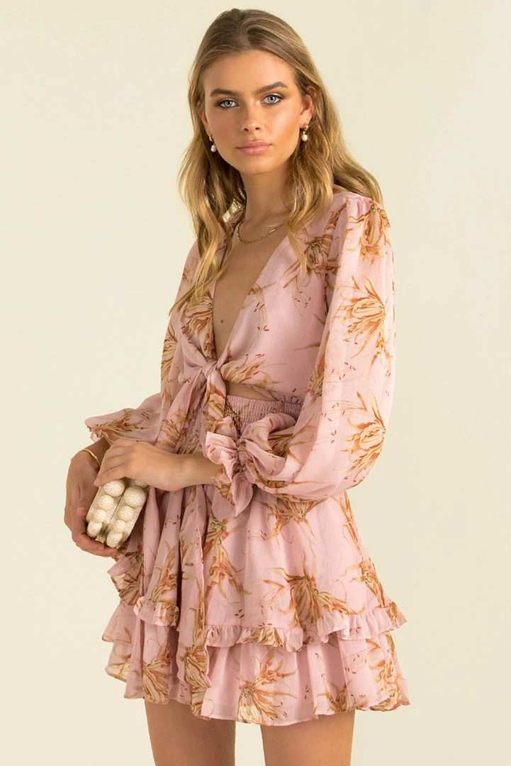 Feel effortlessly beautiful in our Alani Dress! This gorgeous mini dress is made from a high-quality fabric in a dreamy floral print! She features a V neckline with tie-up detail, long sleeves and a frill hemline. Style her with strappy heels and a mini bag for the perfect party look!