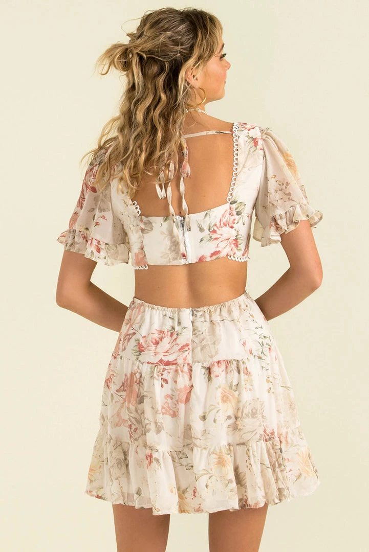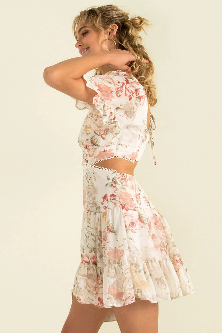 Such a gorgeous floral mini! Our gorgeous Alora Dress is made from the most beautiful floral print fabric in white. She has a flattering v-neckline, short sleeves and a cutout detail at the waist. Style her with mules and a crossbody bag for the perfect weekend look!