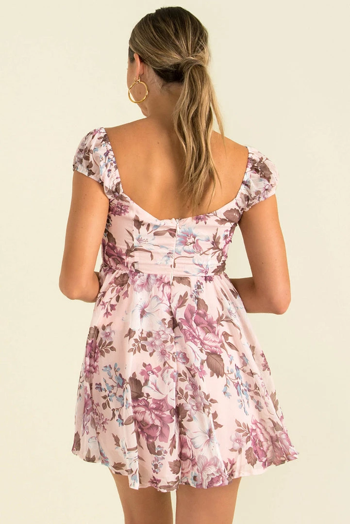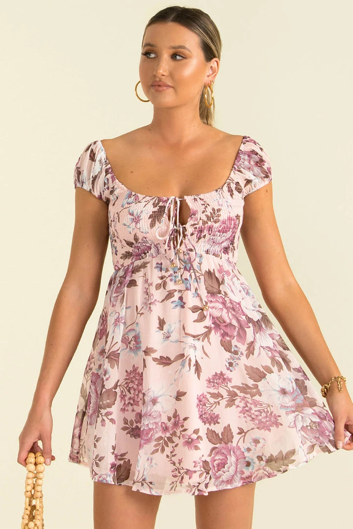 A beautiful floral mini that can take you from day to night! Our stunning Amilla Dress is made from a chiffon fabric in pink with a purple and blue floral print throughout. She features a shirred bust with tie-up details, short sleeves and a relaxed fit skirt. We love her styled with mules and a crossbody bag.