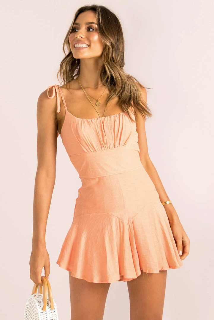Ready for the weekend in our gorgeous Annie Playsuit! Made from a lovely peach fabric, she features gathered bust detailing, a fitted waist and cute tie-up shoulder straps. We love her styled with woven slides and a basket bag – the perfect outfit that will take you from day to night!