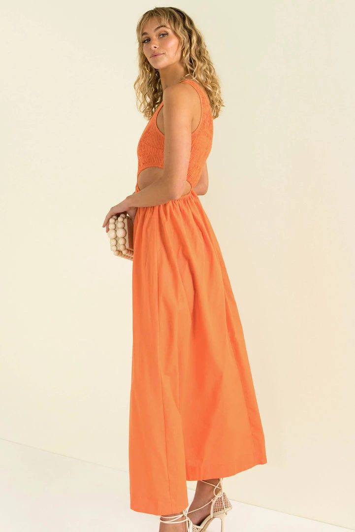 The perfect pop of colour! Our beautiful Asher Dress is made from a high-quality, linen fabric in a beautiful tangerine hue. She features a shirred bodice with one shoulder strap, cutout at the waist and a mid-length skirt. Finish your look with gold hoops, tan heels and a clutch.