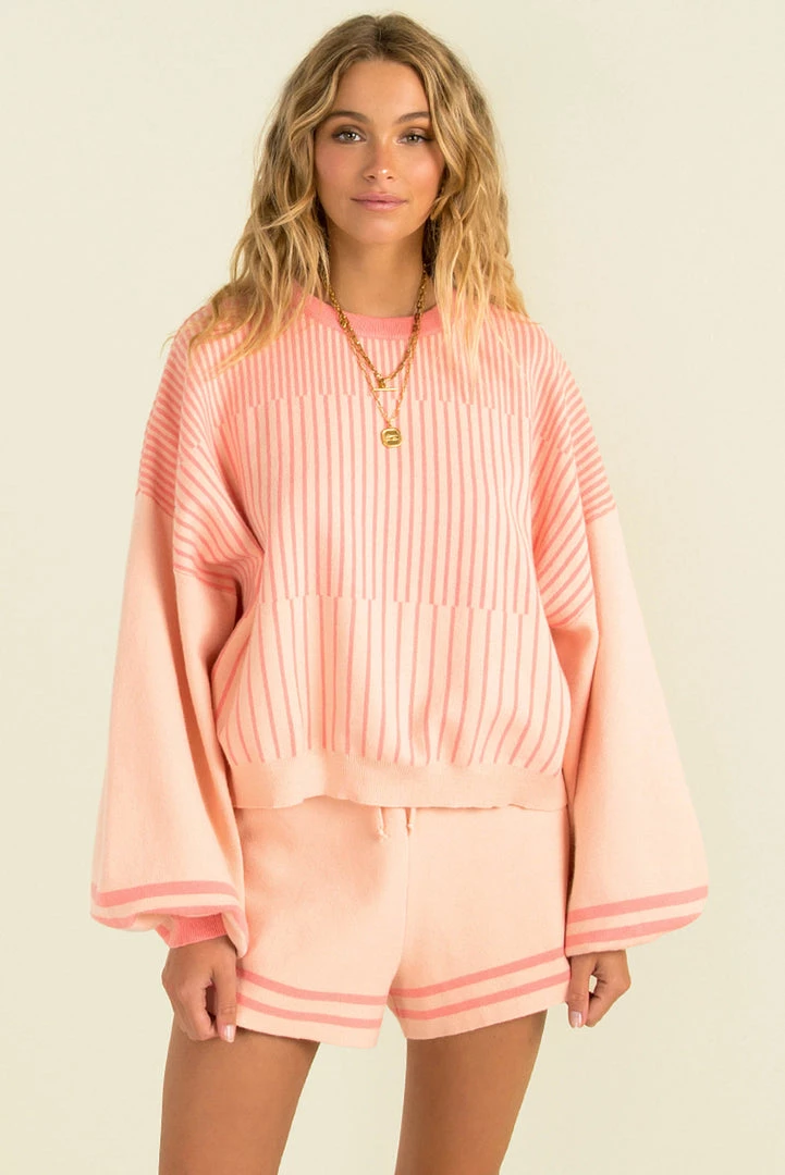 Feel both chic and comfortable in our gorgeous Ashton Top! This over-sized peach knit features a pink design throughout. We love it styled with out matching Ashton Shorts, a crossbody bag and cute sandals for the perfect off-duty look!