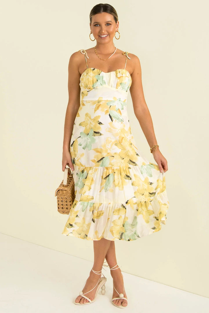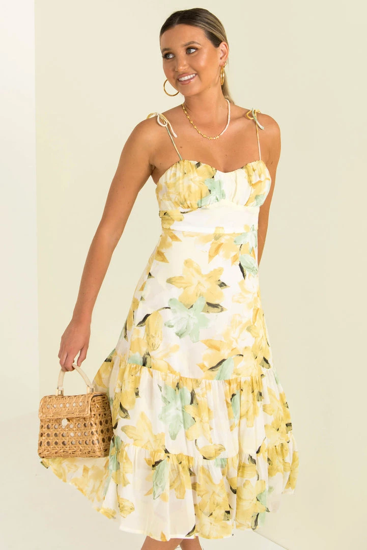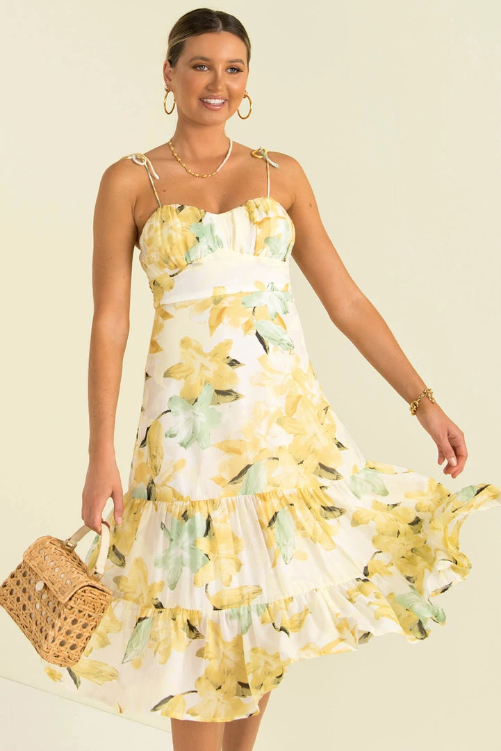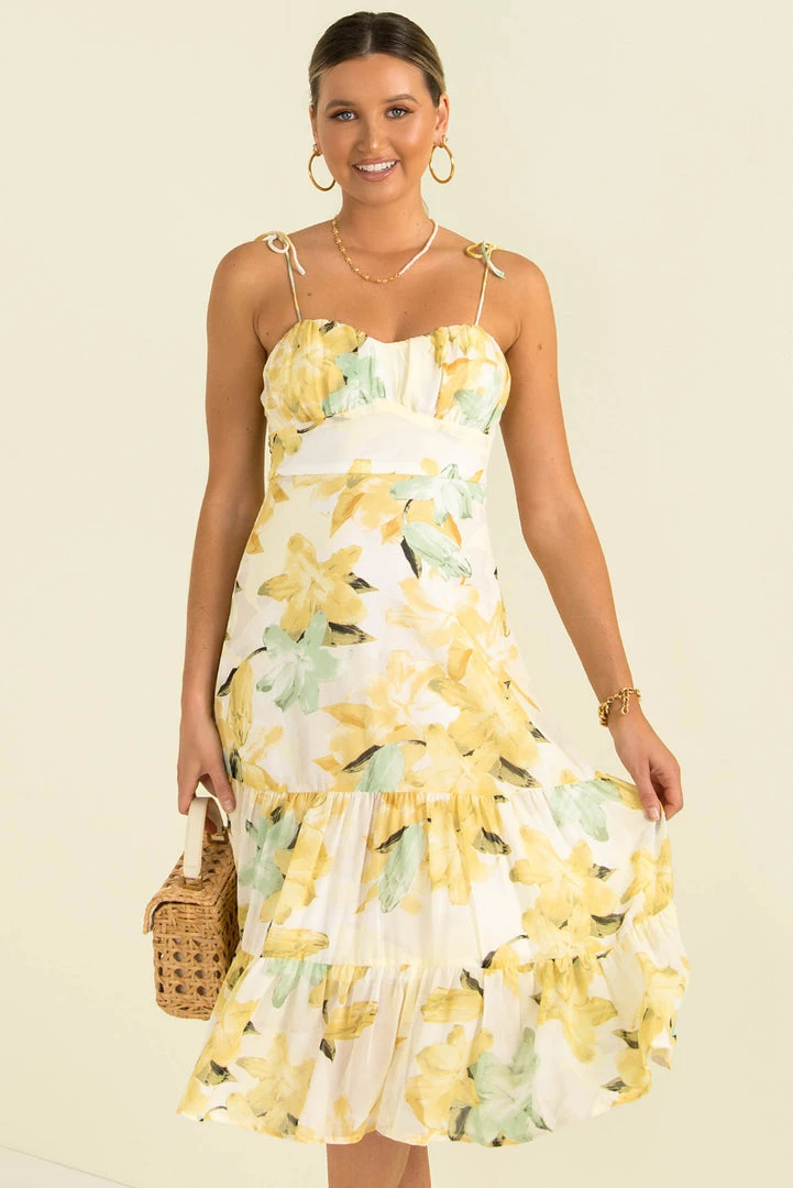 Our beautiful Ayla Dress can take you from day to night! This lovely midi dress is made from white fabric with a yellow floral print throughout. She has all the details we love. a gathered bust, tie-up shoulder straps and a flowing mid-length skirt. Style her with mules and a mini bag for a chic weekend look.