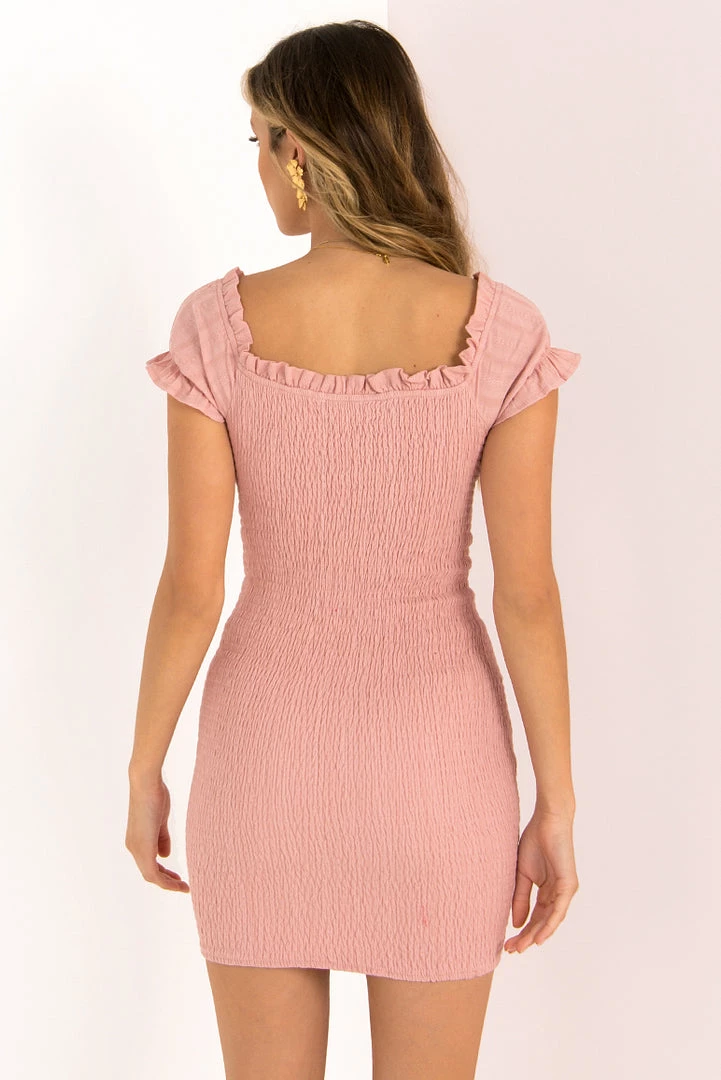 Turn heads in our gorgeous Belle Dress! She’s made from a blush fabric with a stripe texture throughout. She features a structured bust with boning, that’s finished off with a drawstring tie at the front. She also has a fully elasticated back for comfy and perfect fit! We love her styled with mules and a woven bag – perfect for nights drinking red wine with your girls!Â