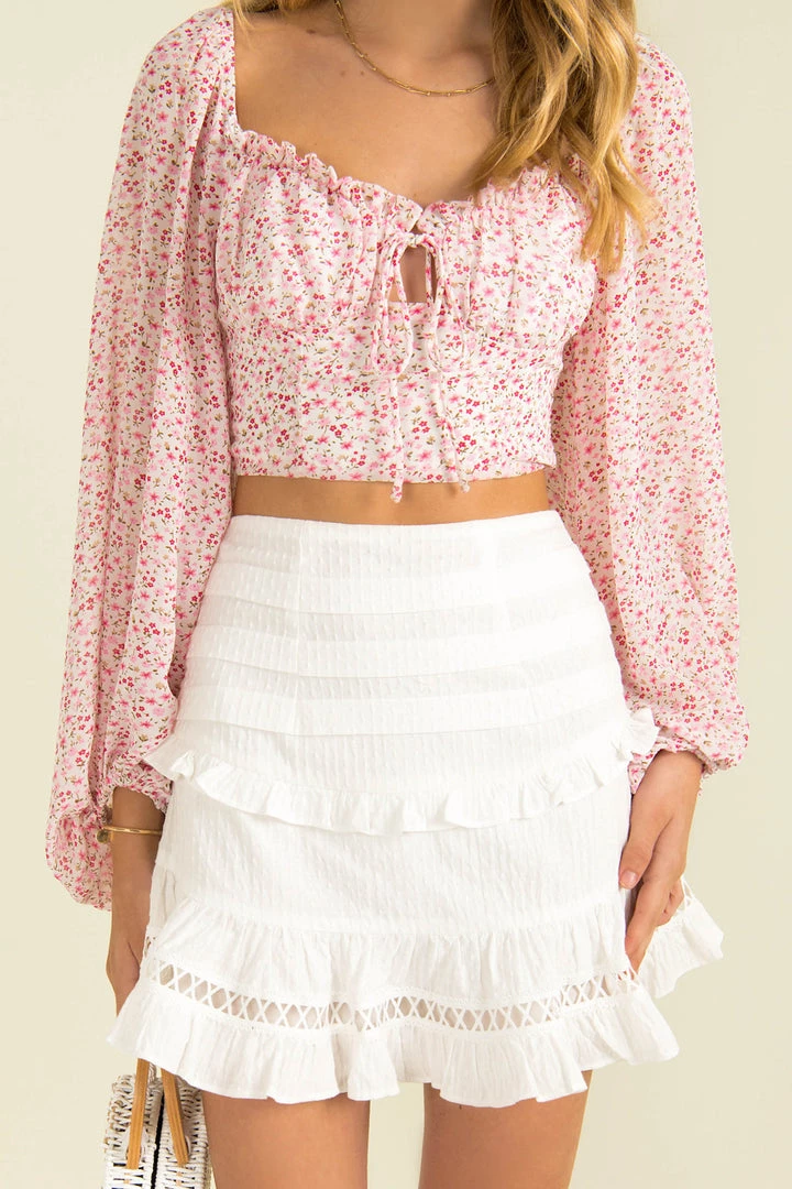 Short and sweet! made from a textured, white cotton fabric, our lovely Bettina Skirt is a high-waisted style with a cute frill hem. She features stunning frill, gathered and cutout detailing throughout. Style her with a floral top and satrapy heels for a cute party look!