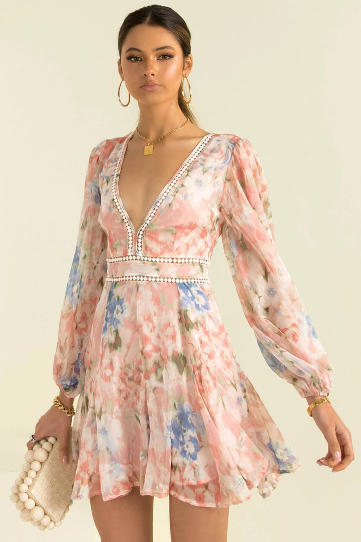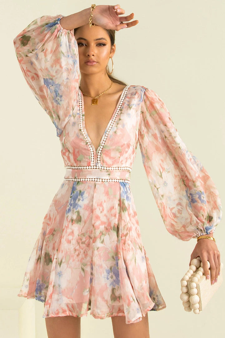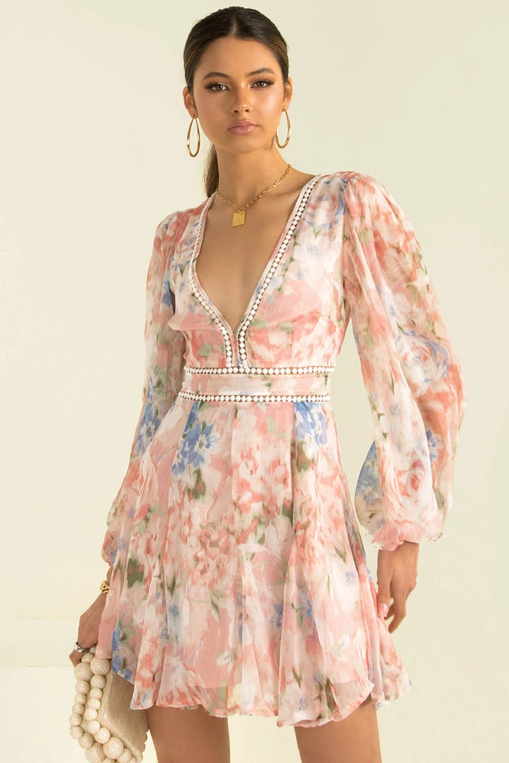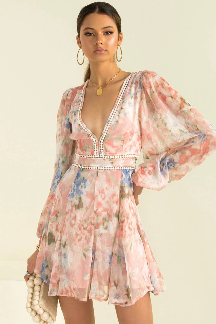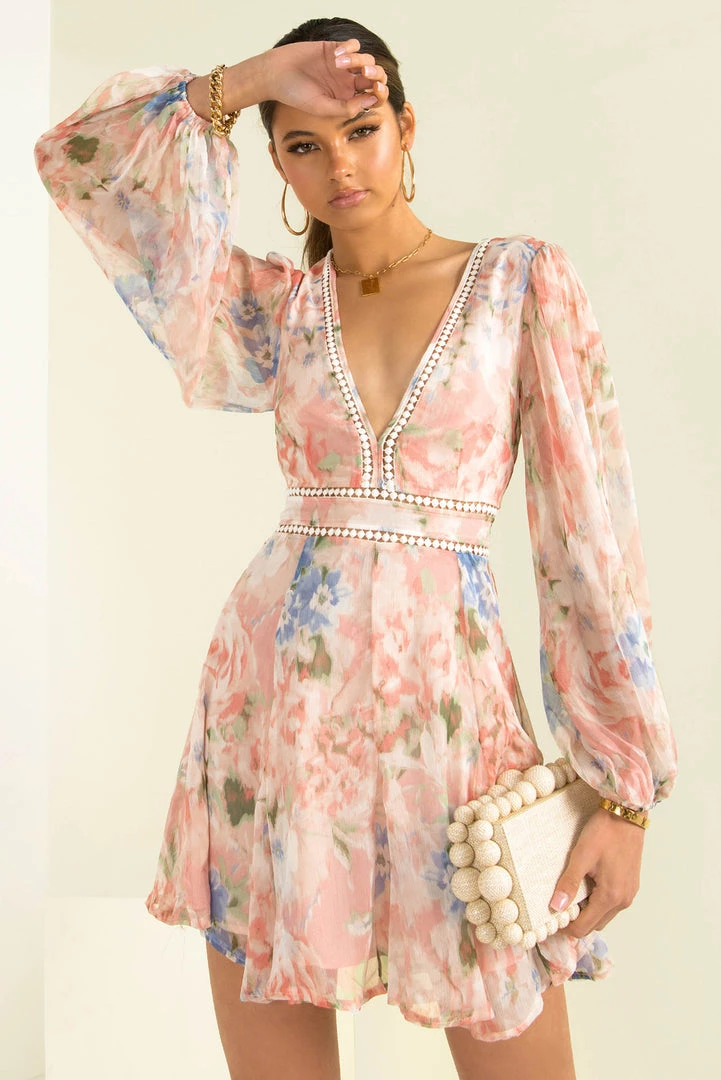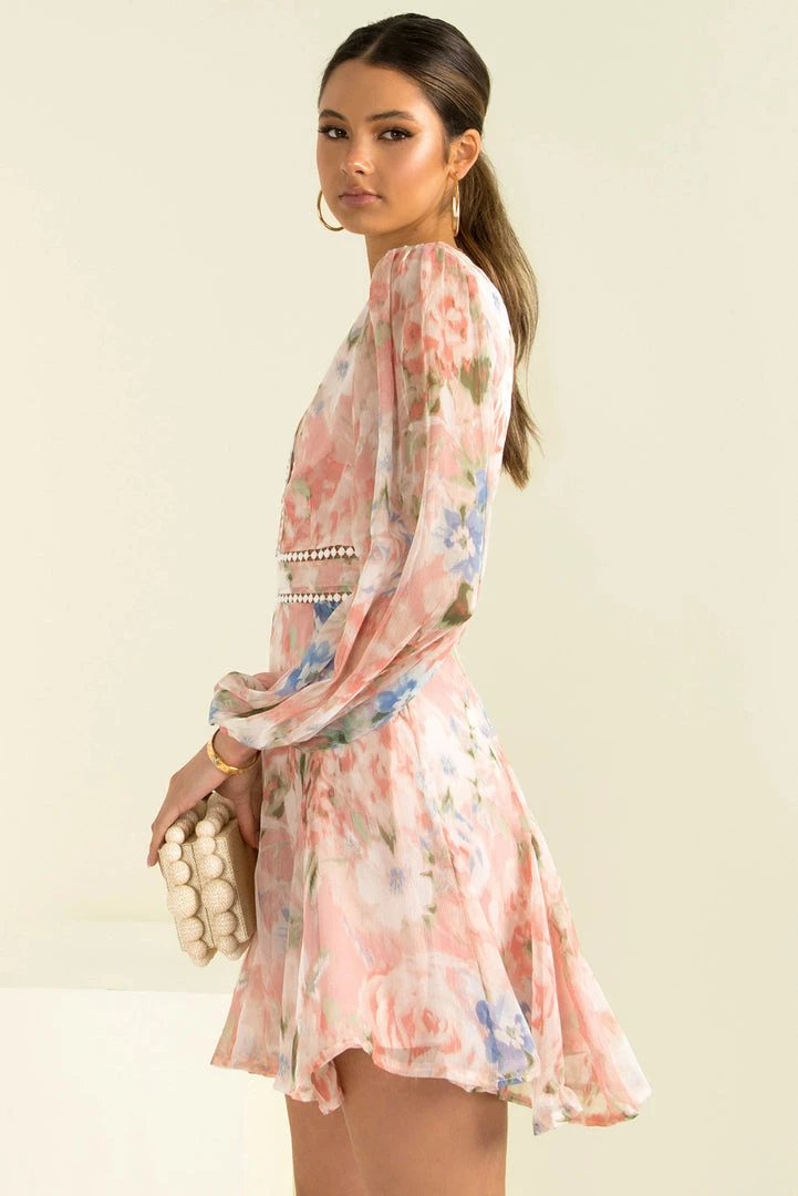 Feel like an absolute goddess in our Bloom Dress! She’s made from a dreamy chiffon fabric with a floral print in shades of pink, green and blue. She has long semi-sheer sleeves, a flattering V neckline and crochet lace trim. She also has the best fit; skimming the waist then flowing into a pleated skirt. Style her with a mini bag and strappy heels for the perfect party look!