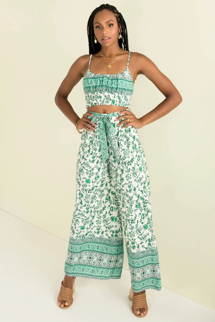 Perfect for your next day trip… Our lovely Byron Top is a cropped style, made from a green and white bohemian print fabric and features gathered detailing at the bust, thin adjustable straps and a shirred hem and shirred elastic panel in the back. We love her styled with our matching Byron Pants for dreamy look! Top and pants sold separately.