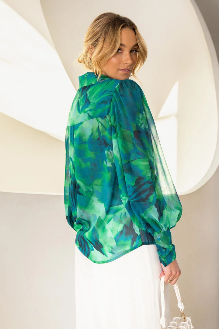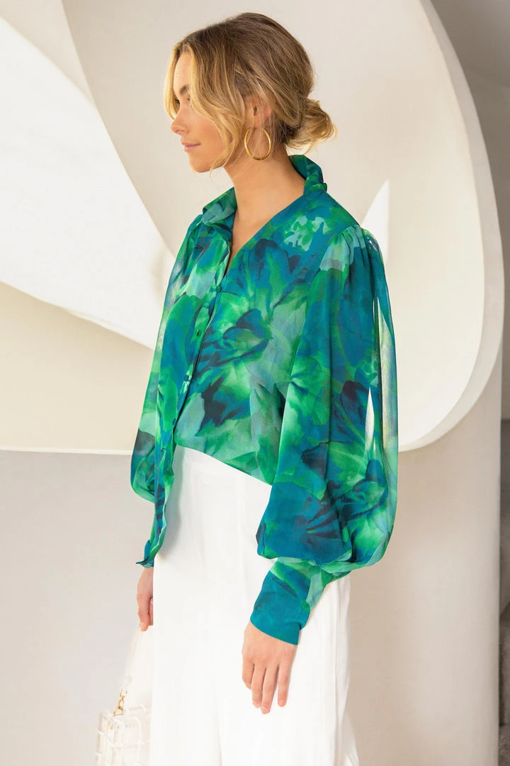 A beautiful blouse in a gorgeous floral print. Our Calista Blouse features long puff sleeves, centre-front buttons and a collared neckline. Style her tucked into high-waisted shorts or wear her unbuttoned over a white crop with denim.Â