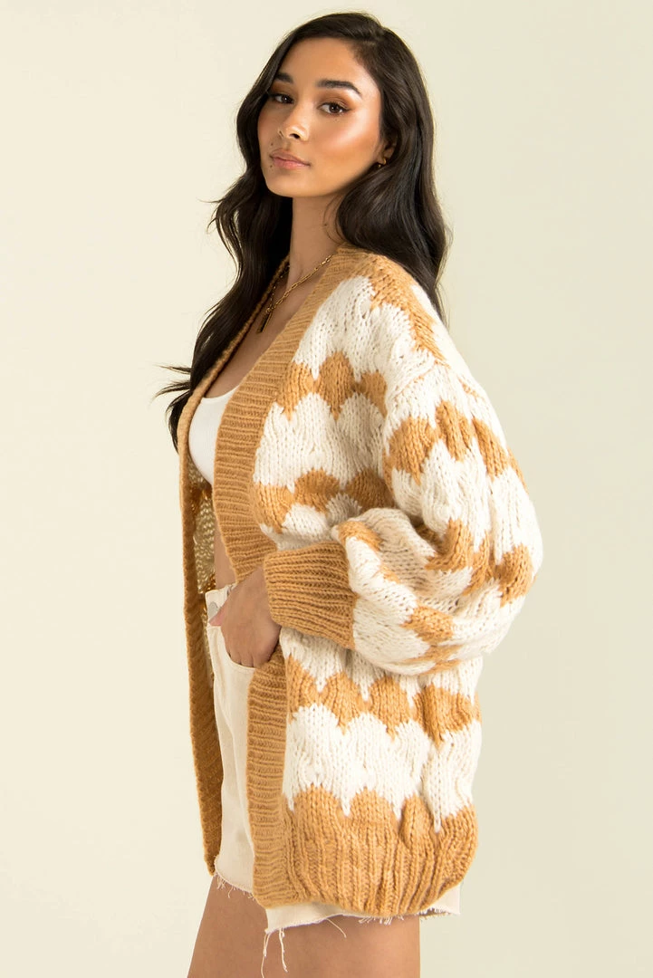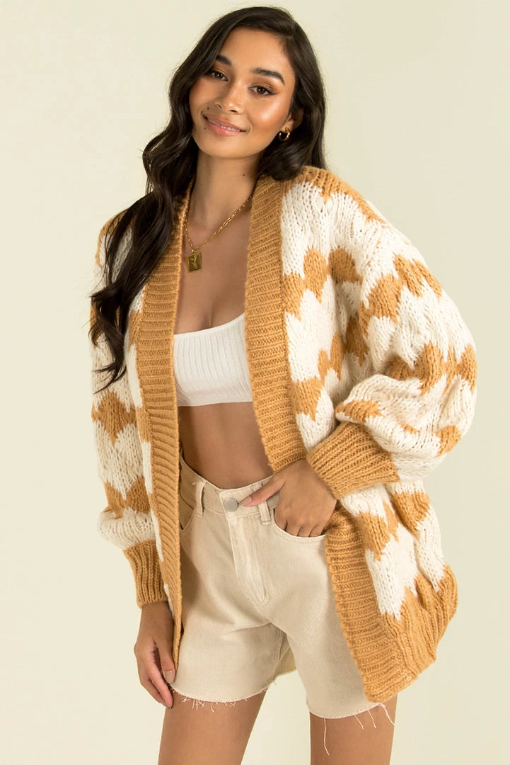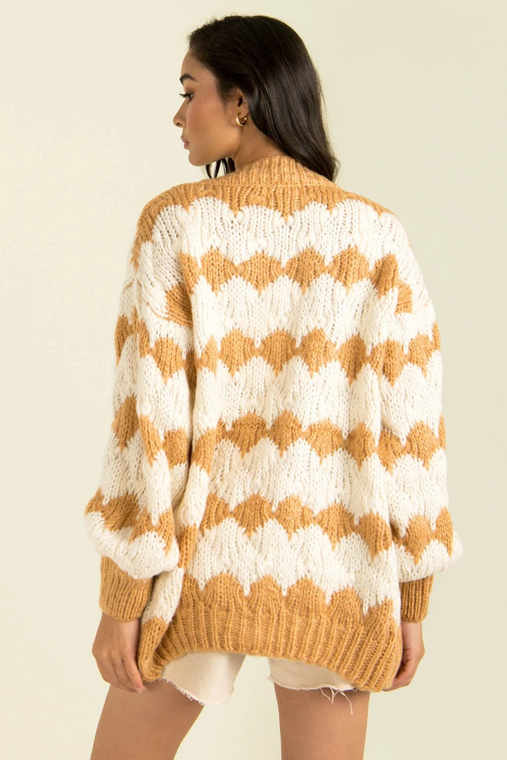 Stay cozy and cool in our gorgeous Ditto Cardigan! This thick and cozy knitted cardi is made from a chunky knit in shades of cream and camel! We love it styled over high-waisted jeans and a white tee!