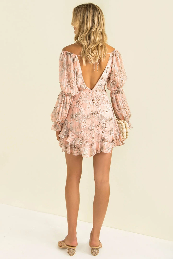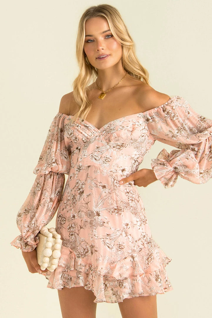 A beautiful long sleeve party dress! Our stunning Carina Dress is made from a lovely stripe textured fabric in pink with a floral design throughout. She features a flattering V neckline, long sleeves, and open back detail and frill hemline. Style her with gold hoops and strappy heels for your next night out!