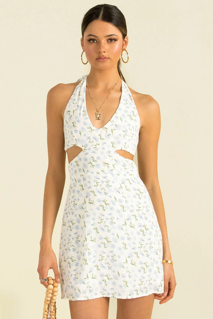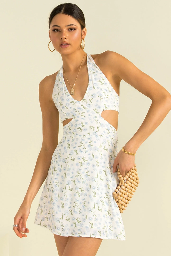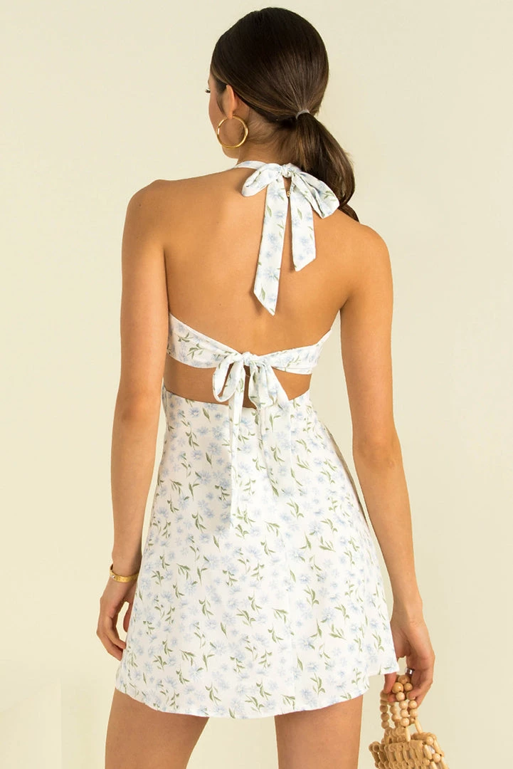 Designed to flatter, our adorable Cassia Dress has all the details we love! This lovely mini dress is made from a white fabric with a dainty, blue floral print throughout. She has a v-neckline with halter-neck straps, cutouts at the waist and an open back with tie-up detail. Style her with mules and a crossbody bag for a gorgeous weekend look!