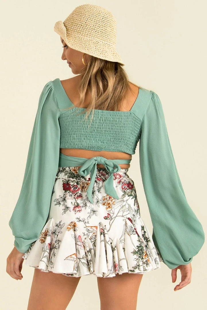 Our beautiful Christa Top is a wardrobe essential! This stunning green top is a cropped style with wrap style front and long billowing sleeves. Style her with denim or dress her up with a mini skirt and strappy heels.