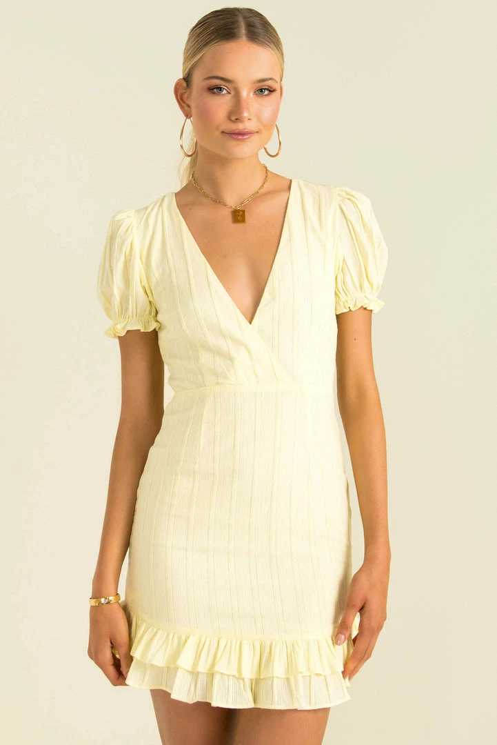 Short and sweet! Our lovely Devin Dress  is made from a lemon coloured fabric with a stripe texture throughout. She features a flattering v-neckline, puff sleeves and a frill hemline. She also has a cute open back with tie-up detailing. Style her with chunky sandals for the day or dress her up with strappy heels and a crossbody bag.Â