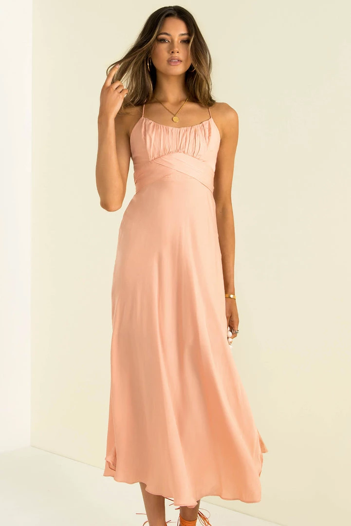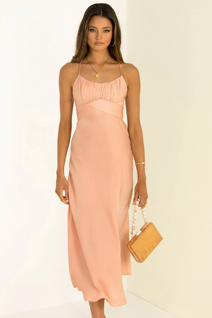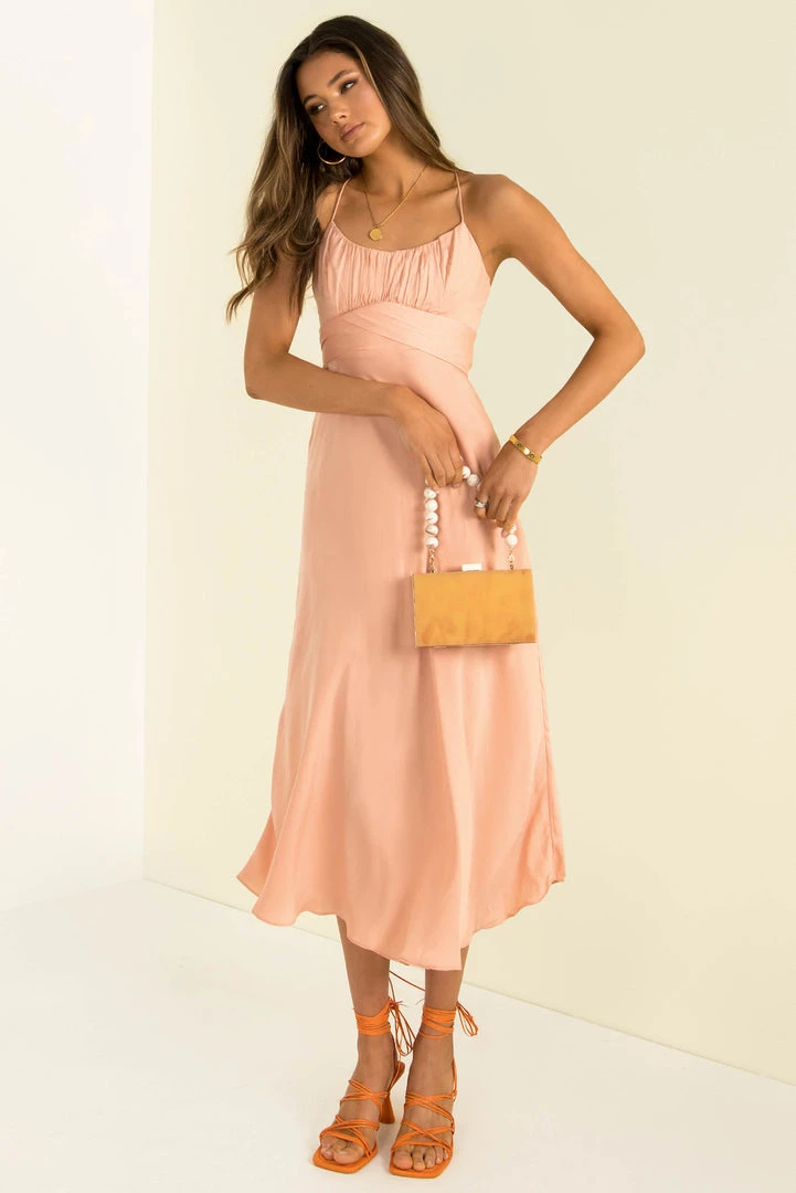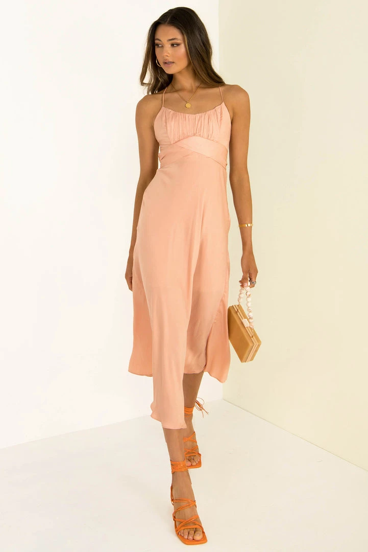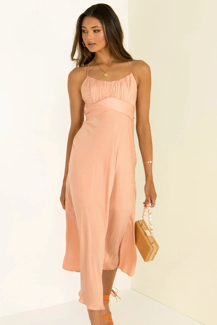 Light up the room in our Adeline Dress! This stunning midi dress is made from a high-quality fabric and features a gathered bust, thin adjustable straps and a sash at the waist that ties in the back. The fabric is silky with a matt finish, skimming the body and draping like liquid to the hem. Team her with strappy heels and a clutch for your next event!