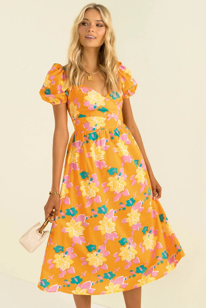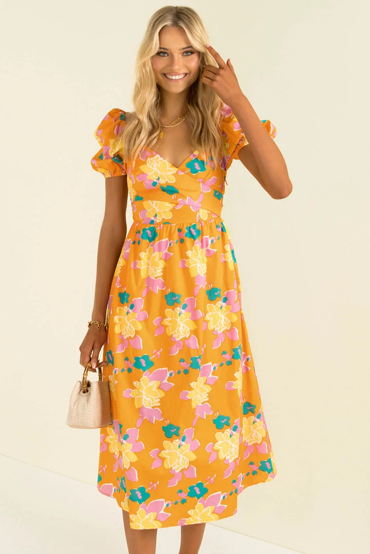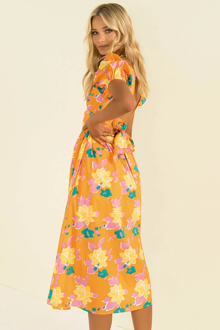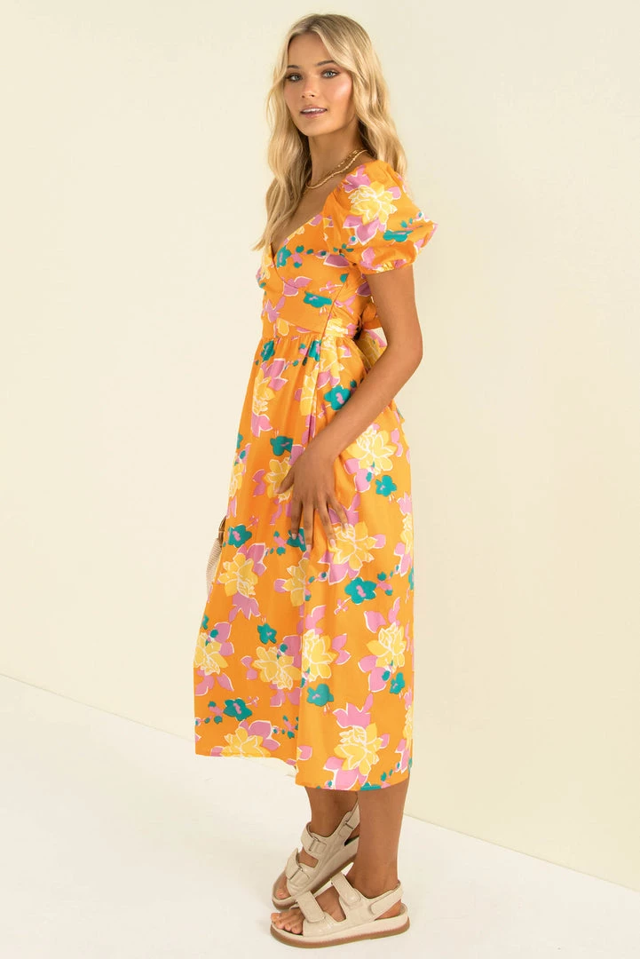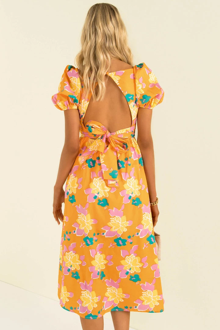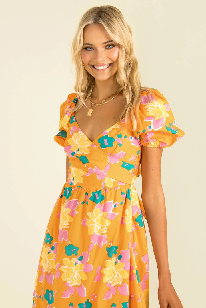 Summer vibes in this fun midi dress! Our Cameron Dress is made from a high-quality floral print fabric in orange. She features a crossover bodice that ties in the back, puff sleeves and a full skirt. She also has a beautiful open back that buttons behind the neck. Style her with mules and a mini bag for a beautiful look that’s perfect for vacation cocktails!