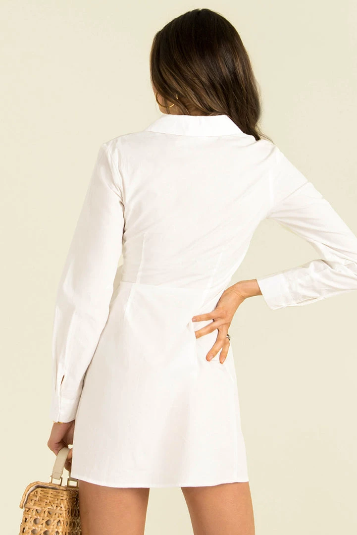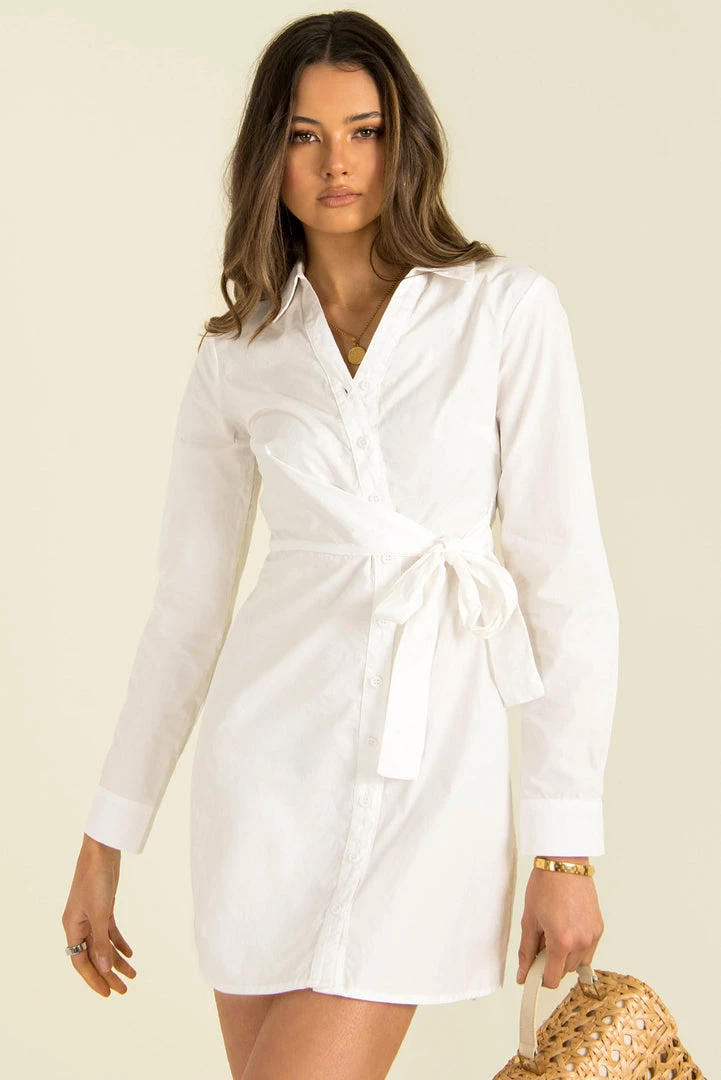 Our Elena Dress is a wardrobe essential! This white, shirt dress features a collared neckline, long sleeves and a button down front. She also has a wrap over detail in the front that ties at the side. Finish your look with mules and a mini bag.