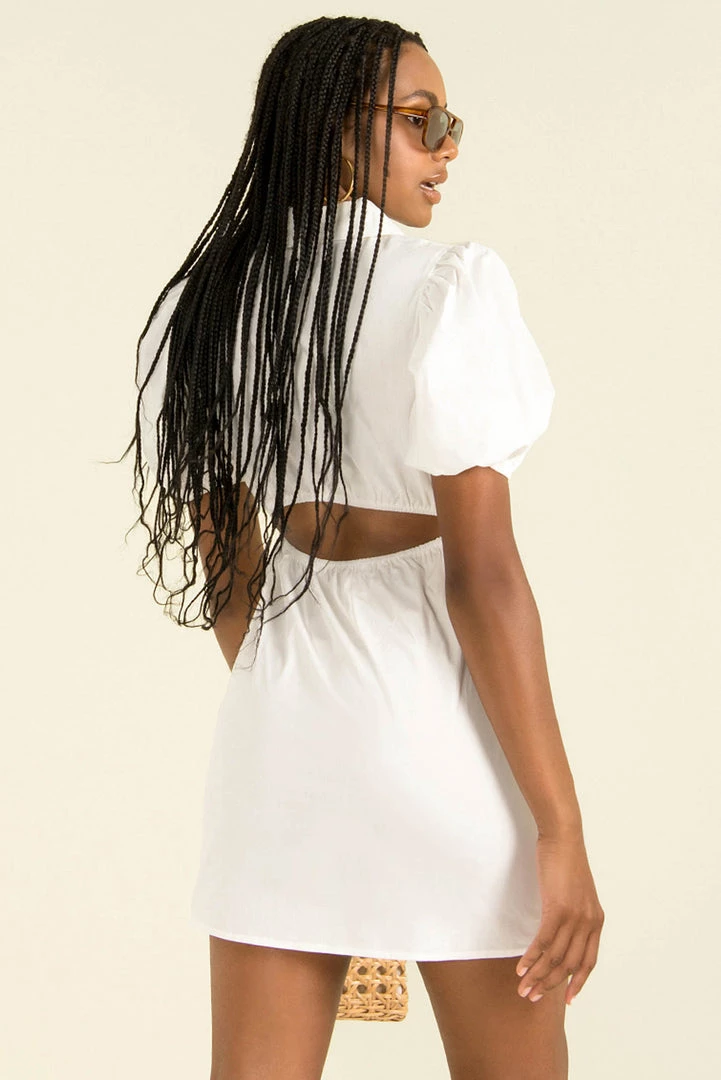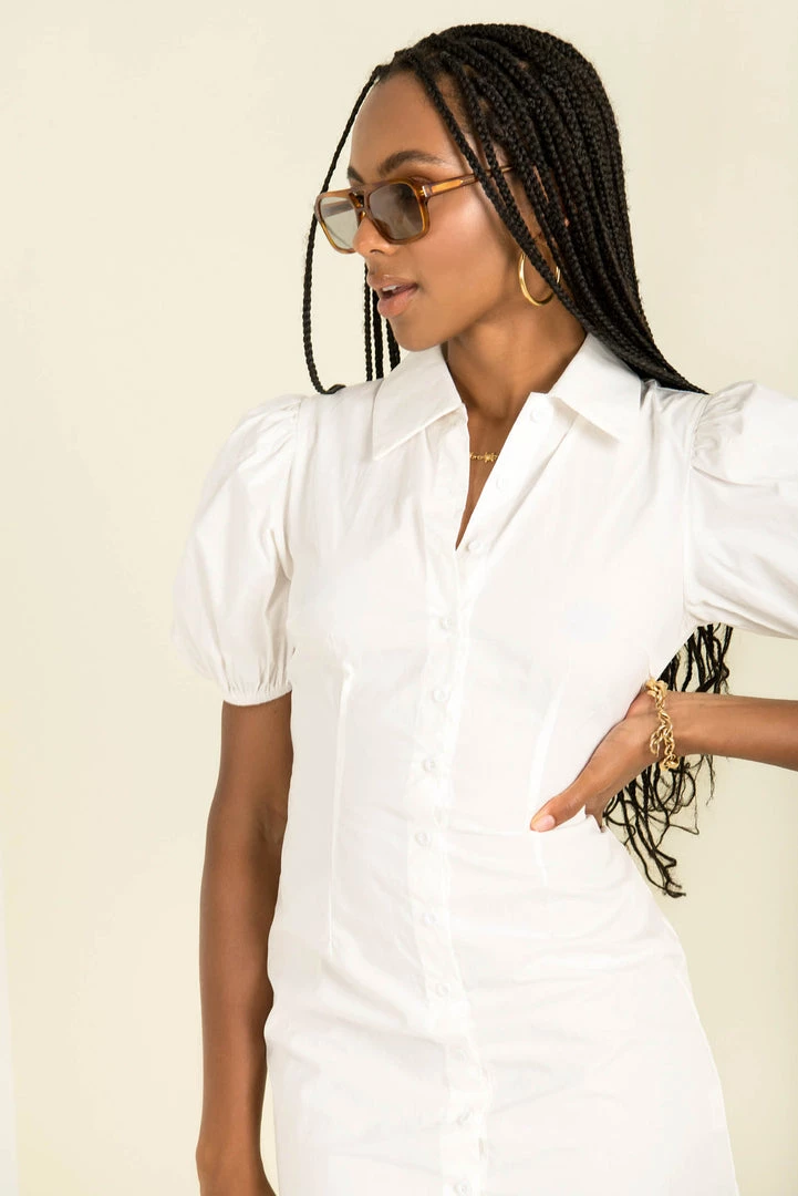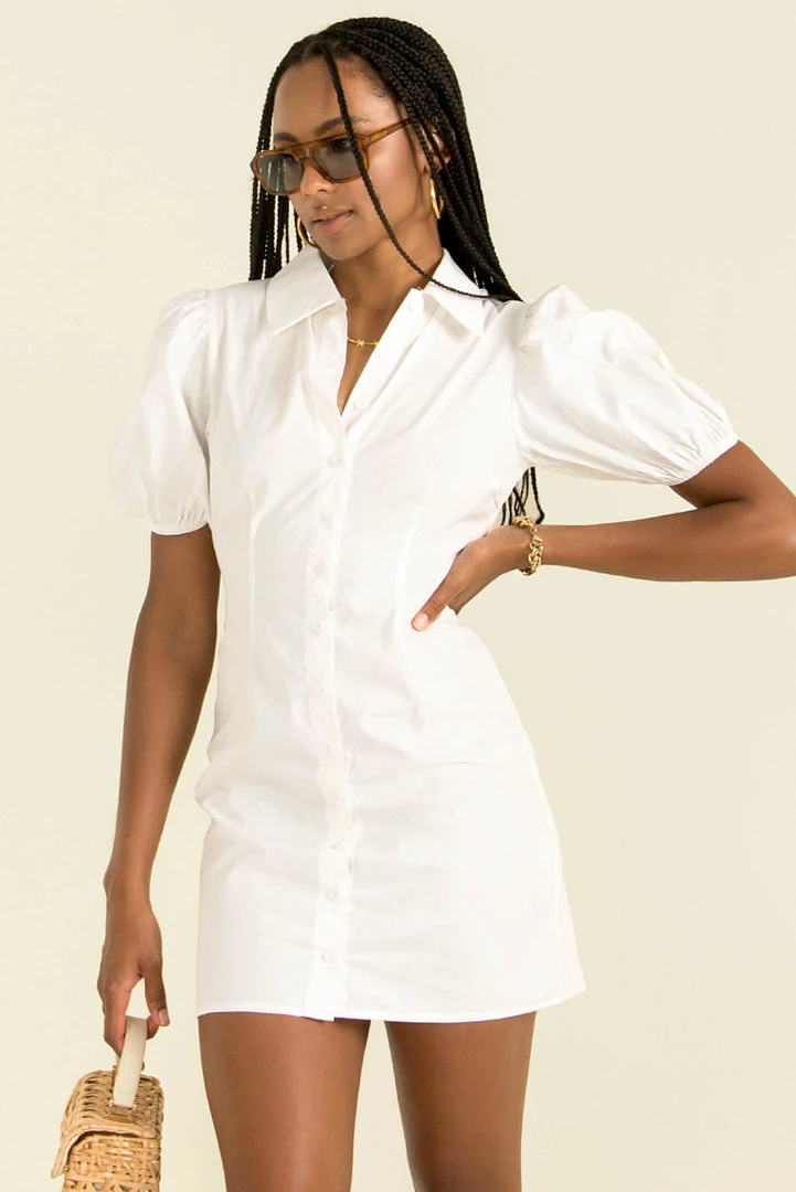 Our Hayden Dress will be a chic addition to your wardrobe! This white, shirt dress features a collared neckline, short puff sleeves and a button down front. She also has a cutout detail in the back with an elastic waist. Style her with chunky sandals for the day or dress her up with neutral heels and a mini bag!