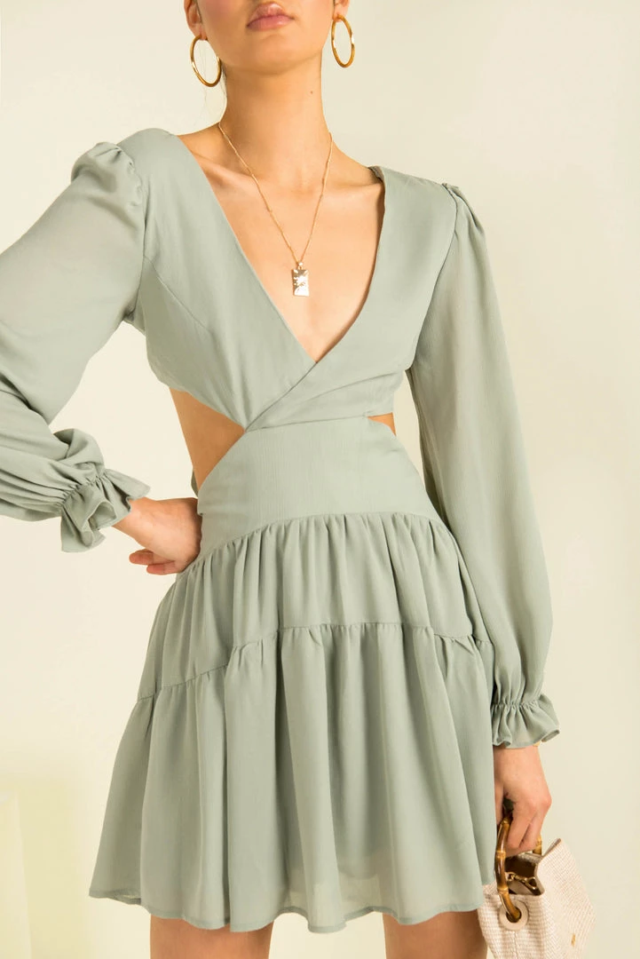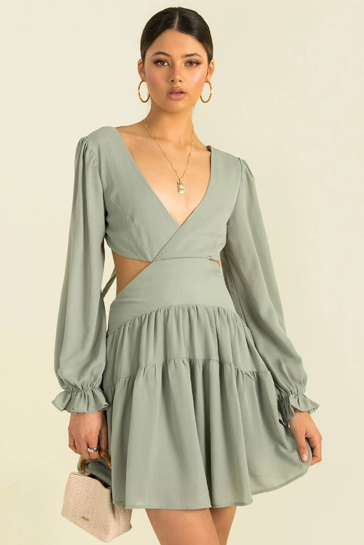 A beautiful mini dress with all the feminine details we love! Our gorgeous Jaclyn dress is made from a Khaki fabric and features long sleeves, a v-neckline and cute cutouts at the waist. She also has the most stunning open back with a tie-up detail. Finish your look with gold hoops, neutral heels and a mini bag.