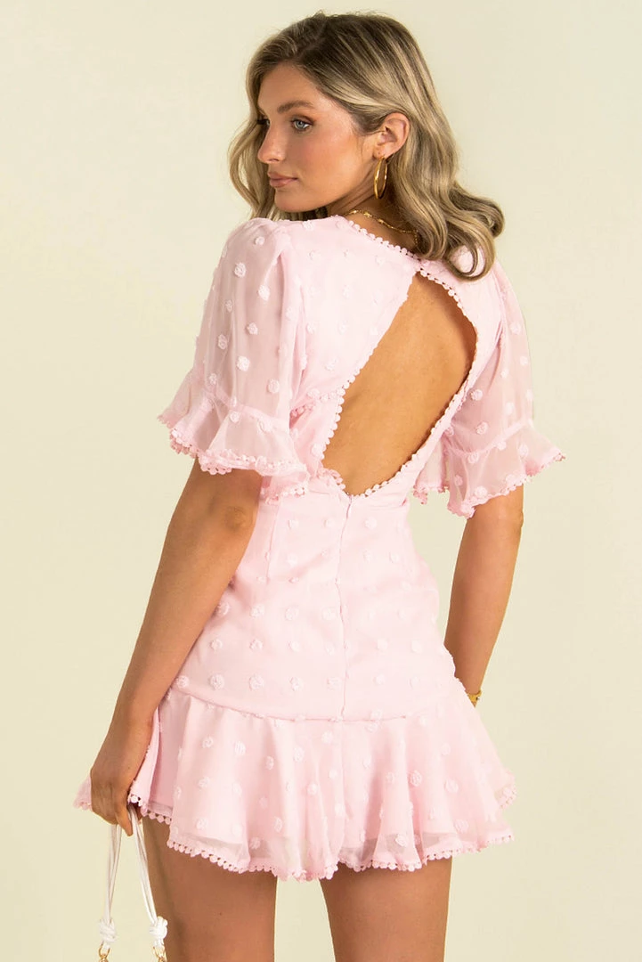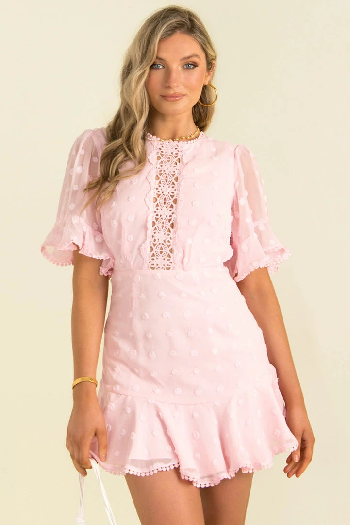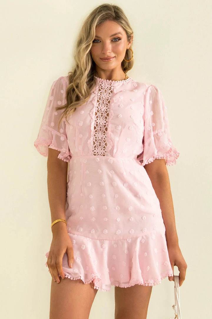 We’re loving our adorable Linnea Dress! This adorable mini dress is made from a chiffon fabric with a spot texture throughout. She features a round neckline, mid-length sleeves and a lace panel through the bodice. Stye her with strappy heels and gold accessories for the perfect party look!