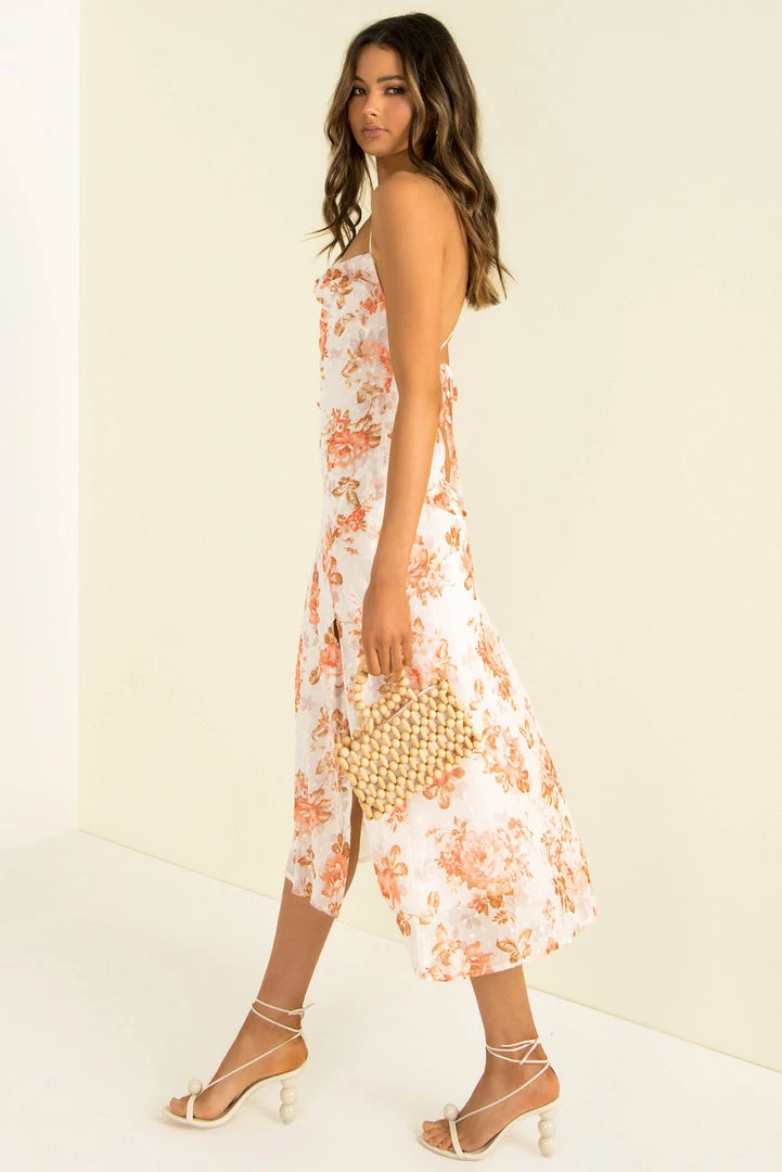 Turn heads in our stunning Portia Dress! This gorgeous midi dress is made from an high-quality fabric in white with a peach floral print throughout. She features a slight cowl neckline, a split in the front and thin adjustable straps and a crossover lace-up back. Style her with nude heels and gold hoops for your next night out!