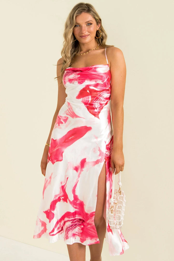 Turn heads in our stunning Portia Dress! This gorgeous midi dress is made from a white fabric with a dreamy hot pink print throughout. She features a slight cowl neckline, a split in the front and thin adjustable straps and a crossover lace-up back. Style her with nude heels and gold hoops for your next night out!