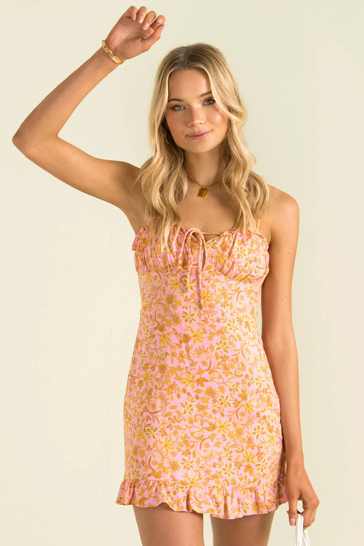 Feel like a babe in this gorgeous floral mini! Our Prudence Dress is made from a pink floral print fabric and features a drawstring neckline with tie, a gathered  bust, fitted waist and a skirt that skims the body. Style her with tan sandals and a woven bag for total Summer vibes!