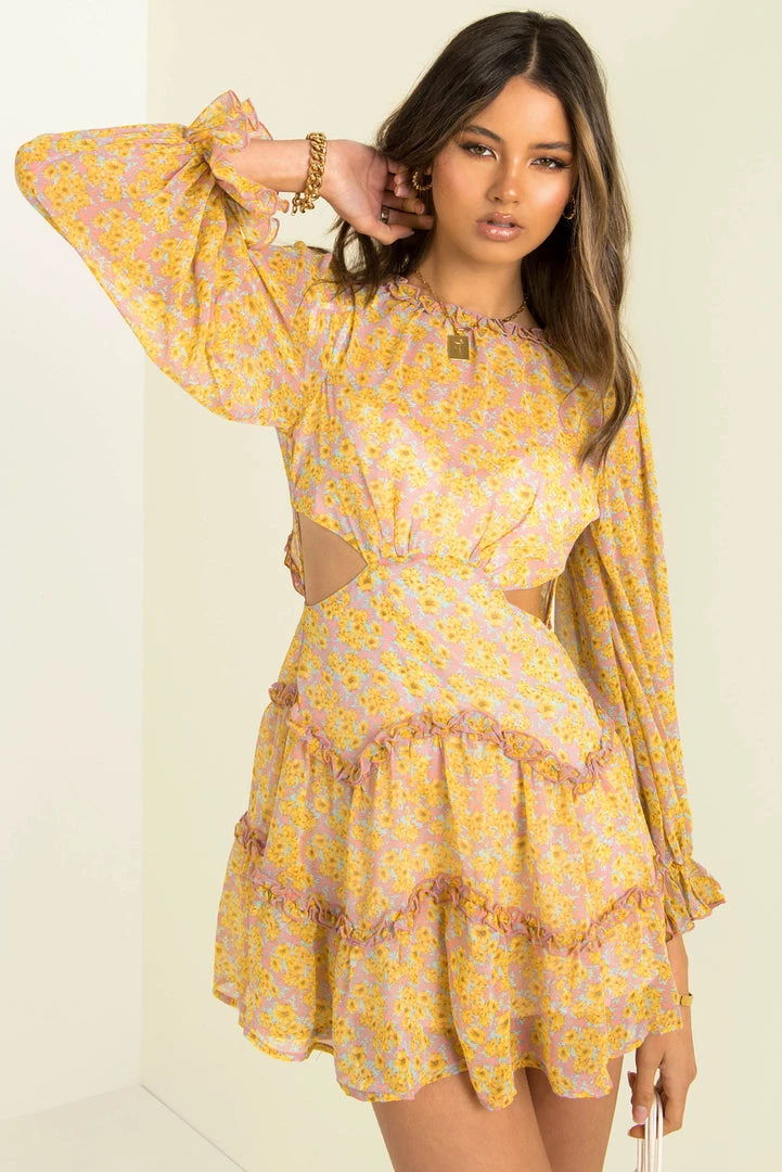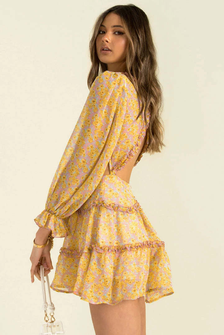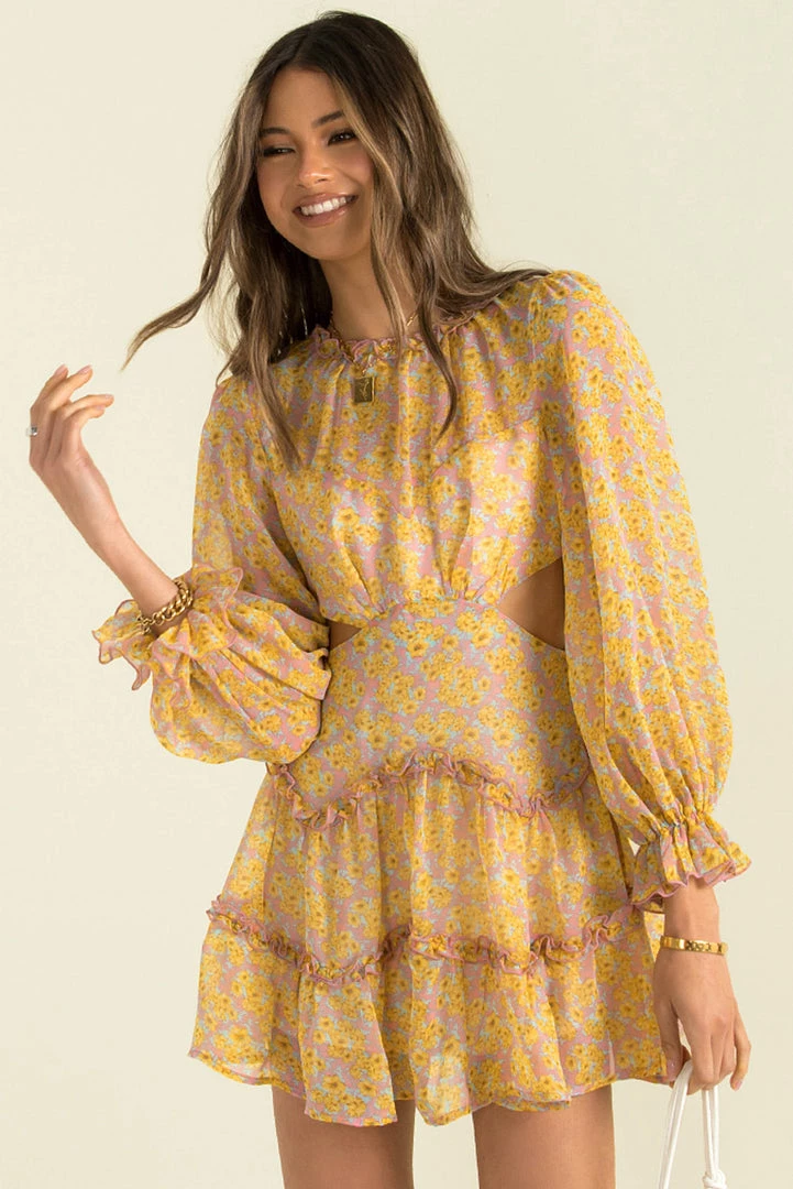 Get swept away by our lovely Virgo Dress! This gorgeous mini is made from a dreamy chiffon fabric with a yellow and pink floral print throughout. She features a high neckline, long sleeves, a cutout through the waist and an open back. Style her with tan heels and a mini bag fr your next night out!