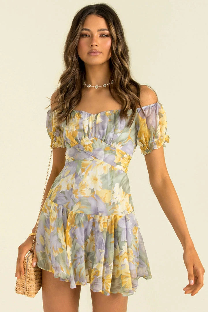 Such a dreamy print! Our lovely Willa Dress is made from a floaty fabric in a beautiful yellow and blue floral print. She features cute puff sleeves, a sash at the waist that ties in the back and a frill hem. Style her with strappy heels and a mini bag, the perfect look for your next special occasion or weekend out with the girls!Â