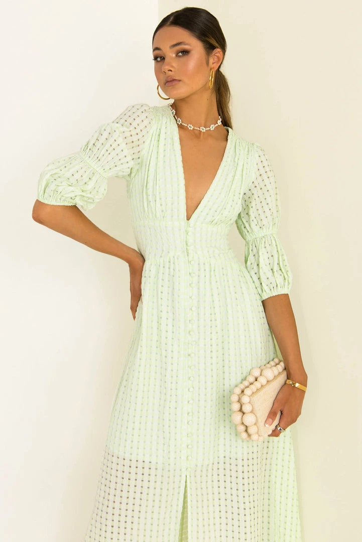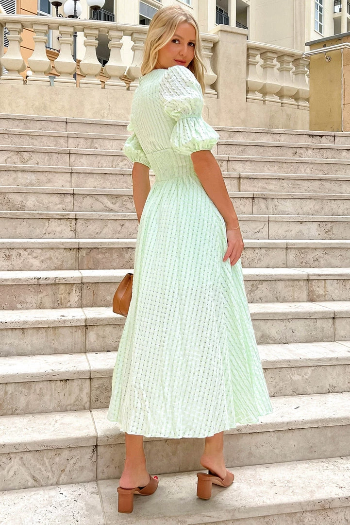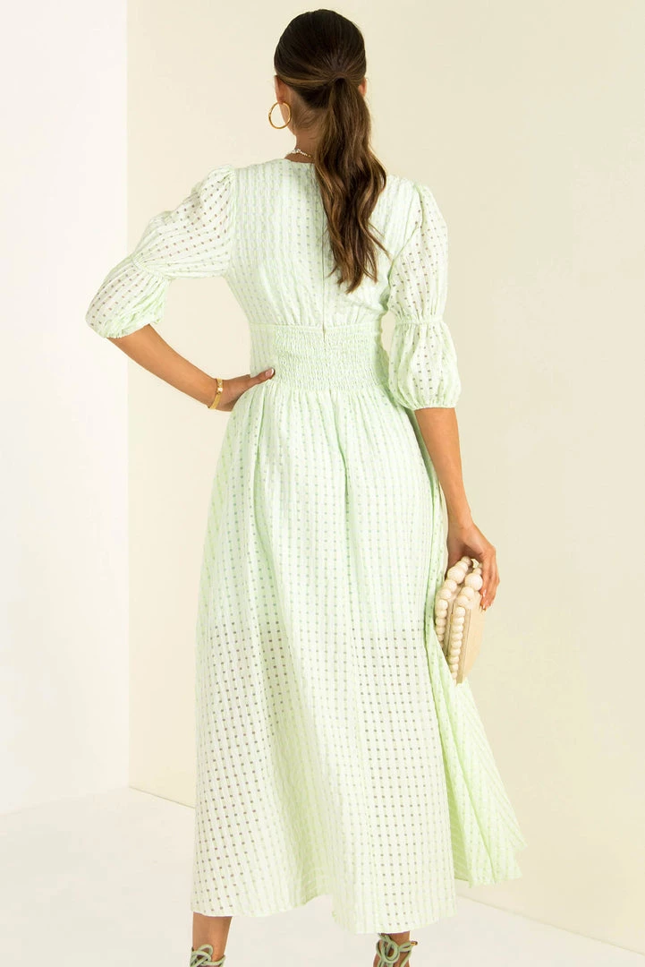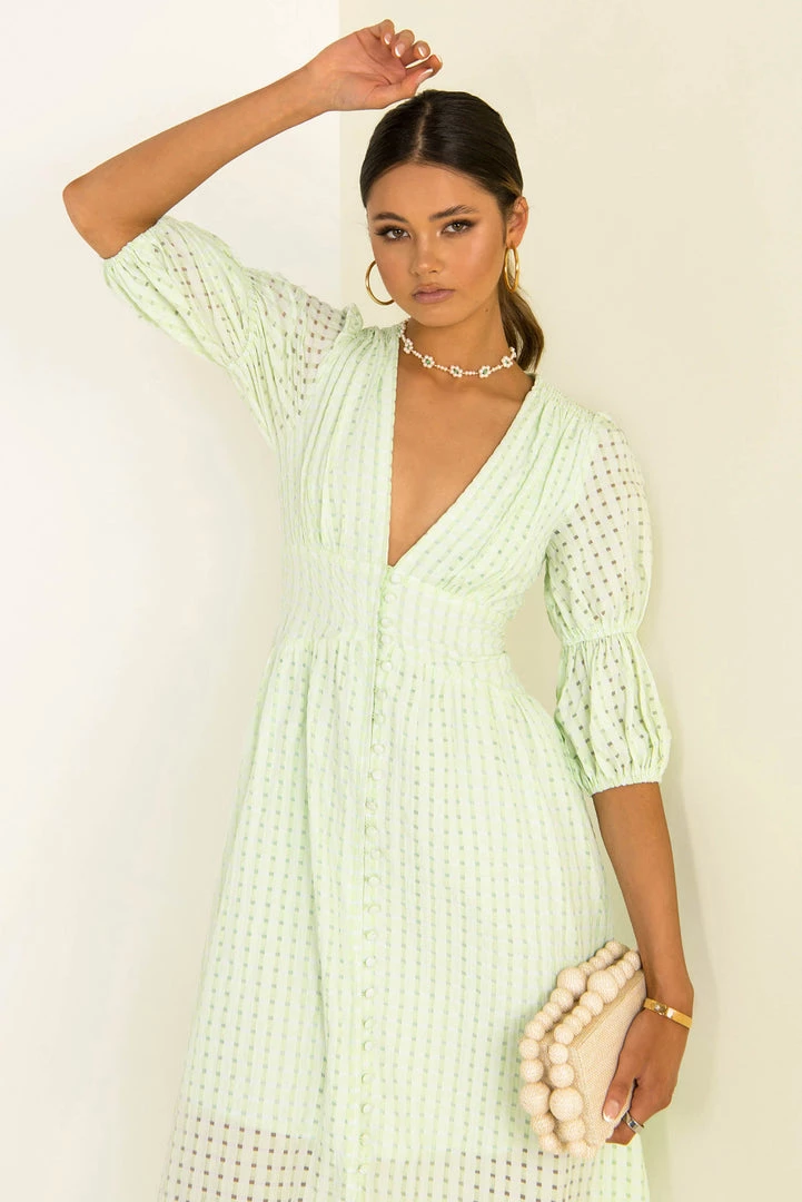 Feel like a dream in our beautiful Edie Dress! This stunning midi dress is made from a high-quality, textured fabric in a lovely mint green. She features a button down front, shirred detailing on the shoulders and mid-length, puff sleeves. Finish your look with gold hoops, a clutch and tan mules.
