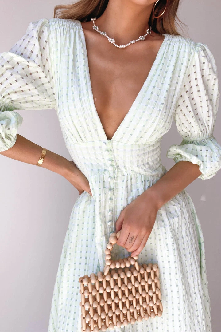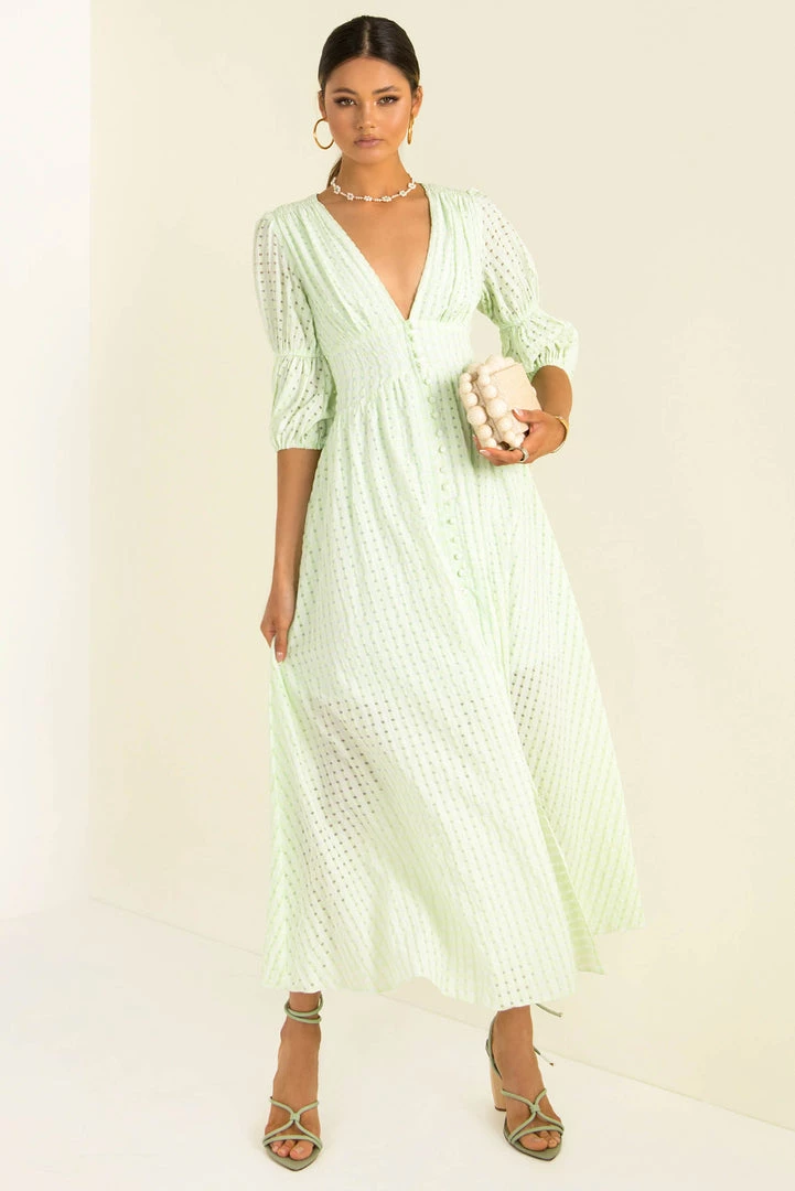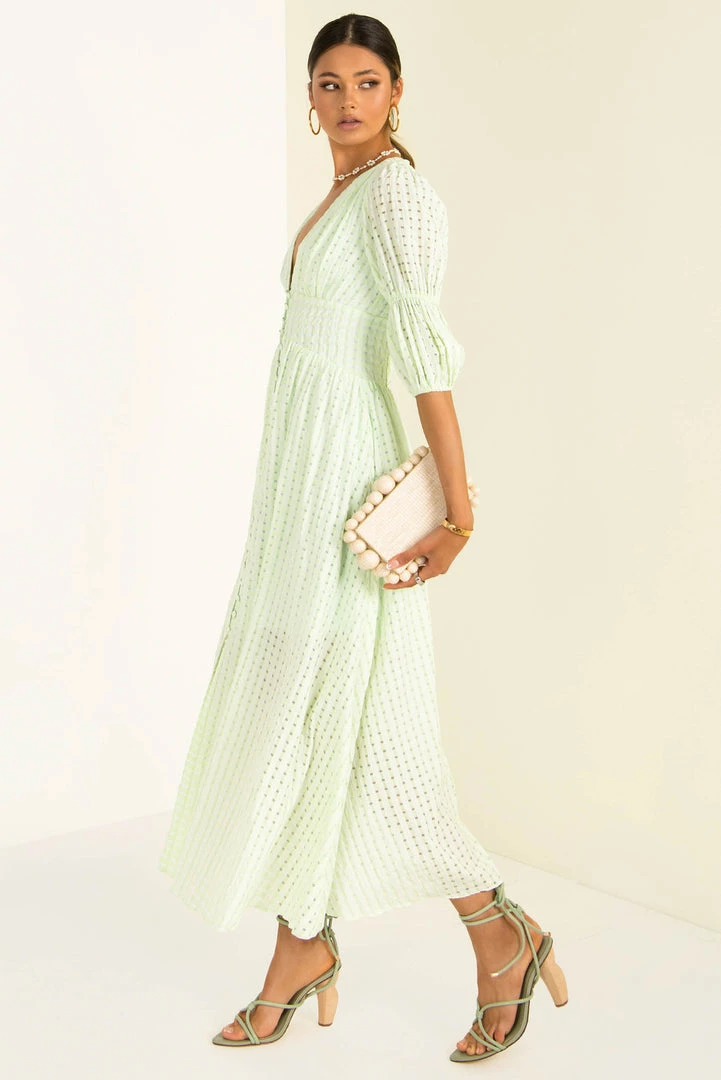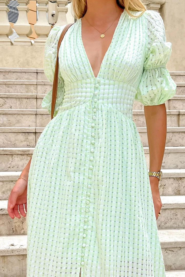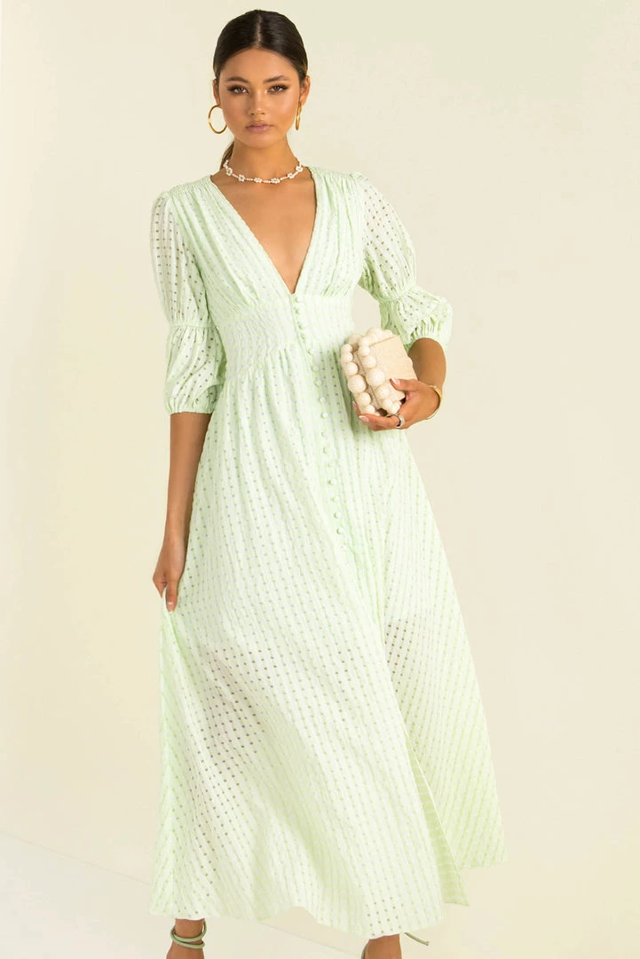 Feel like a dream in our beautiful Edie Dress! This stunning midi dress is made from a high-quality, textured fabric in a lovely mint green. She features a button down front, shirred detailing on the shoulders and mid-length, puff sleeves. Finish your look with gold hoops, a clutch and tan mules.