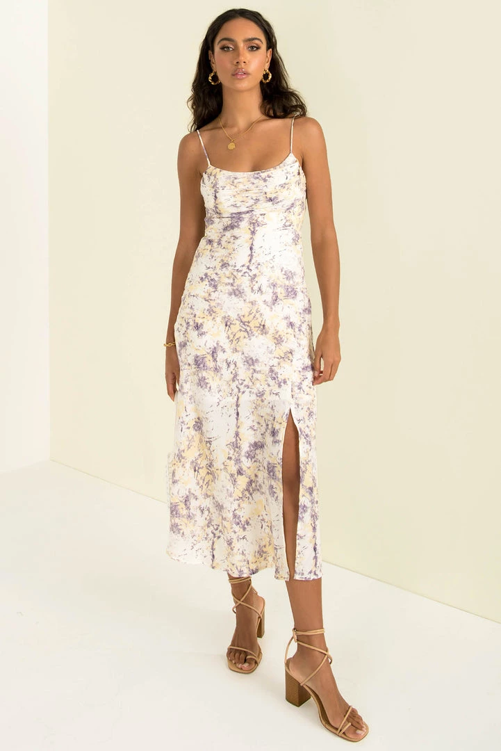 Feel like an absolute goddess in our Estelle Dress! This beautiful midi dress is made from a lovely white fabric with a soft purple print throughout. She features draping across the bust, thin adjustable straps and a min-length skirt. Style her with gold jewellery, a clutch and nude heels for your next event!