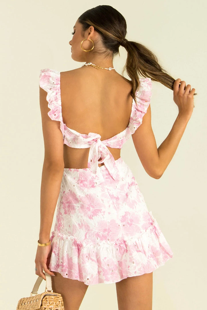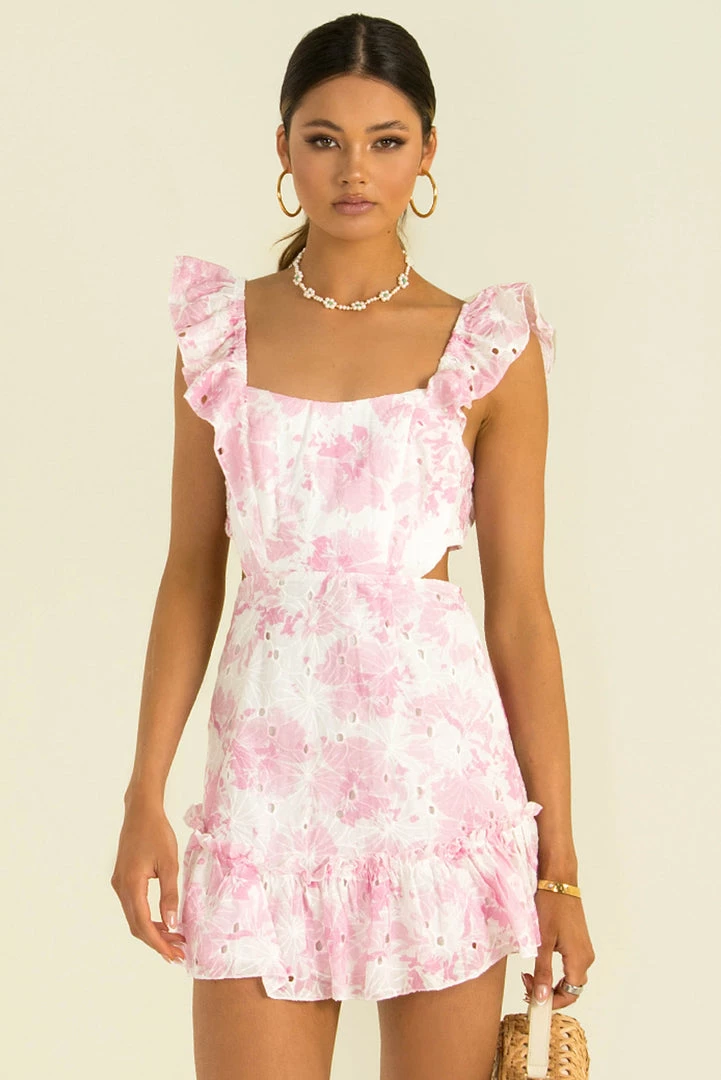 Feel beautiful in our stunning Everleigh Dress. This gorgeous mini is made from high-quality anglaise fabric with a pink floral print throughout. She features ruffle shoulder straps and an open back with a lovely tie-up detail. Style her with gold accessories and strappy heels for your next special occasion!
