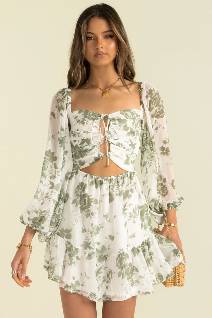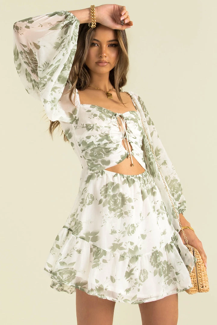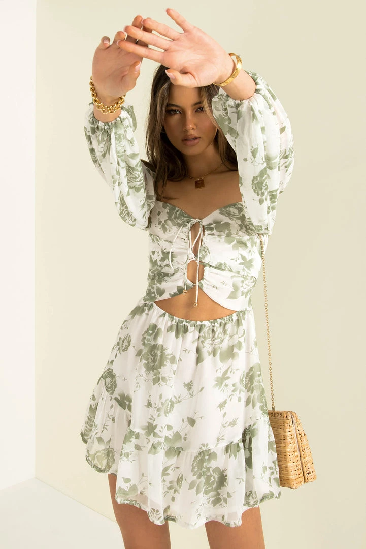 A floaty mini dress in a fresh floral print! This stunning mini is made from a high-quality chiffon fabric in white with a green print throughout. She features long sleeves, tie-up detailing through the bodice and a frill hemline. Style her with mules and a mini bag for a lovely weekend look.