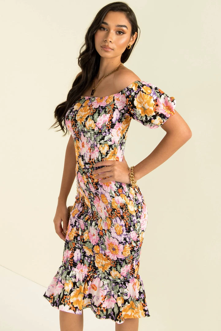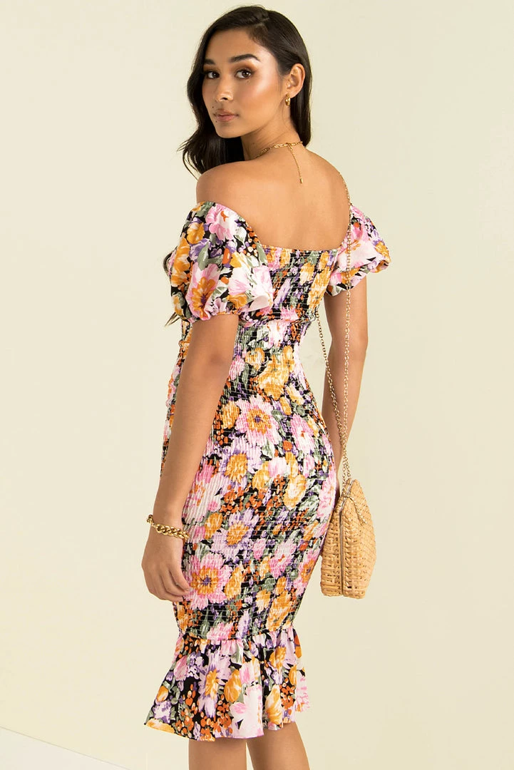 The most beautiful midi dress! Our gorgeous Christina Dress is an off the shoulder style made from stunning floral print fabric. She has short puff sleeves, a frill hem and a shirred elastic body for a comfy and perfect fit! Style her with gold hoops, mules and a crossbody bag!