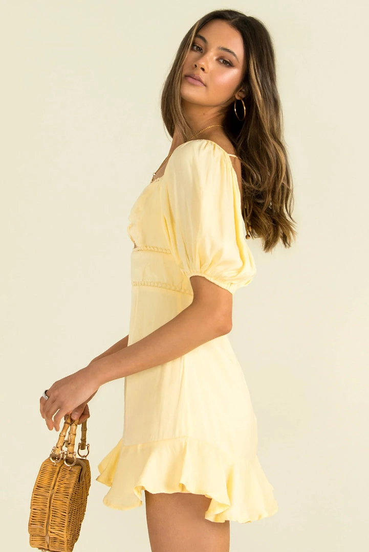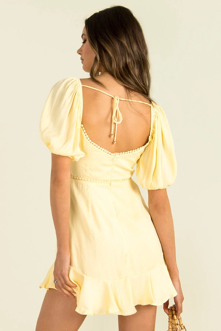 Feel like a ray of sunshine in our cute Gabby Dress! Â This lovely mini is made from a high-quality fabric in a soft yellow hue. She features short puff sleeves, cupped bust, a cutout in the front and a low back with tie-up feature. Style her with strappy heels and a mini bag for an effortlessly gorgeous look!