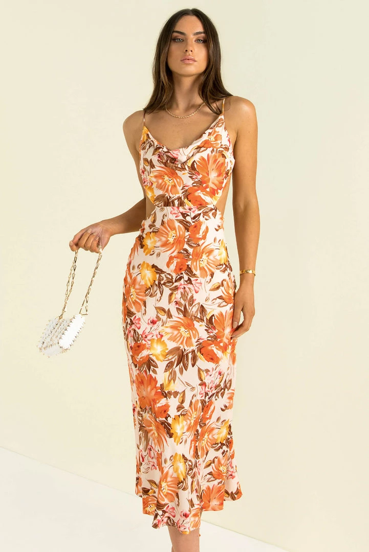 Designed to flatter, our stunning Hardy Dress is perfect for your next event! This beautiful midi dress is made from a high-quality floral print fabric in shades of pink, orange and brown. She features cowl neckline, cutouts at the waist and mid-length skirt. Finish your look with gold hoops, neutral heels and a clutch.