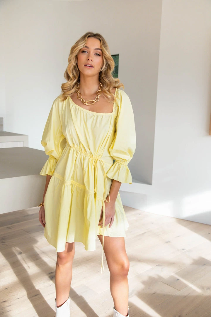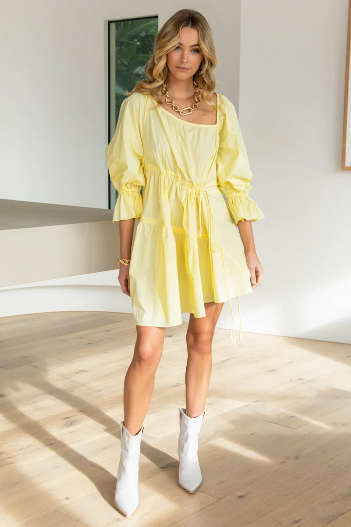 Feel like a ray of sunshine in our gorgeous Harvi Dress. This lovely mini has a relaxed fit and is made from a crisp cotton fabric in yellow. She features an asymmetric neckline, mid-length sleeves and drawstring details in the front. Finish your look with cowboy boots and a crossbody bag.
