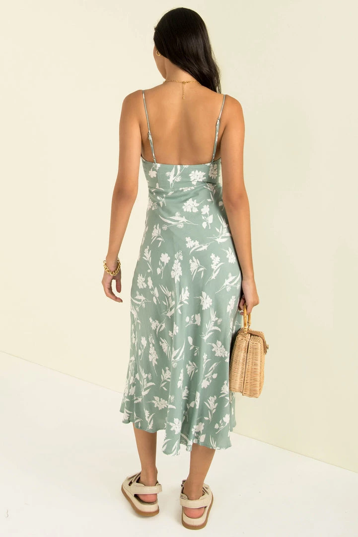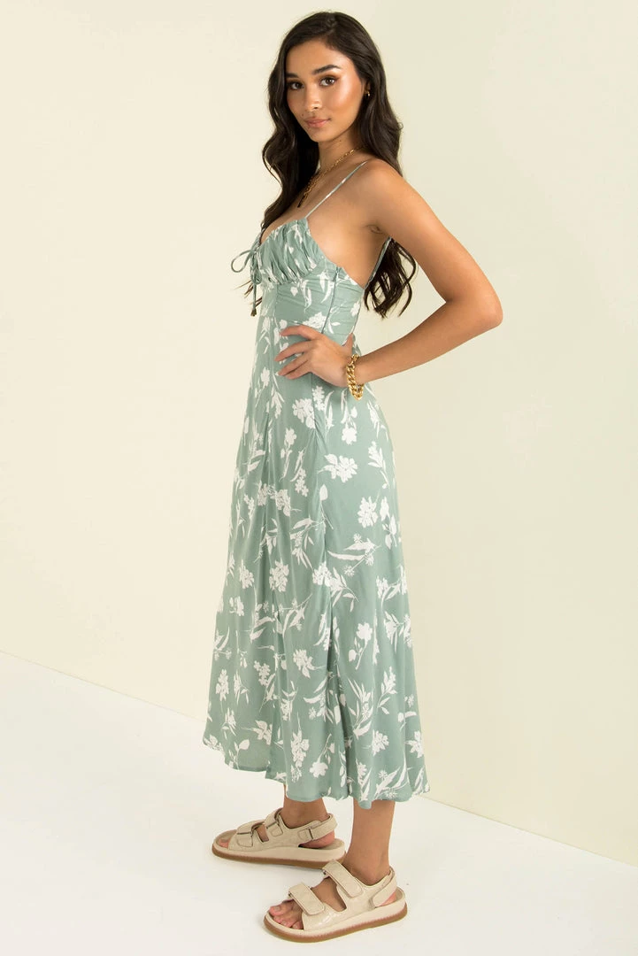 Effortlessly beautiful! This stunning midi is made from a high-quality fabric in sage green with a floral print throughout. She features a cupped bust with padding  that’s adorned with gathered detailing and finished with a tie in the middle. She also has the best fit! The fabric falling like liquid, skimming the body and slightly flaring toward the hemline for movement as you walk. Style her with sandals for the day or dress her up with stroppy heels and a mini bag!