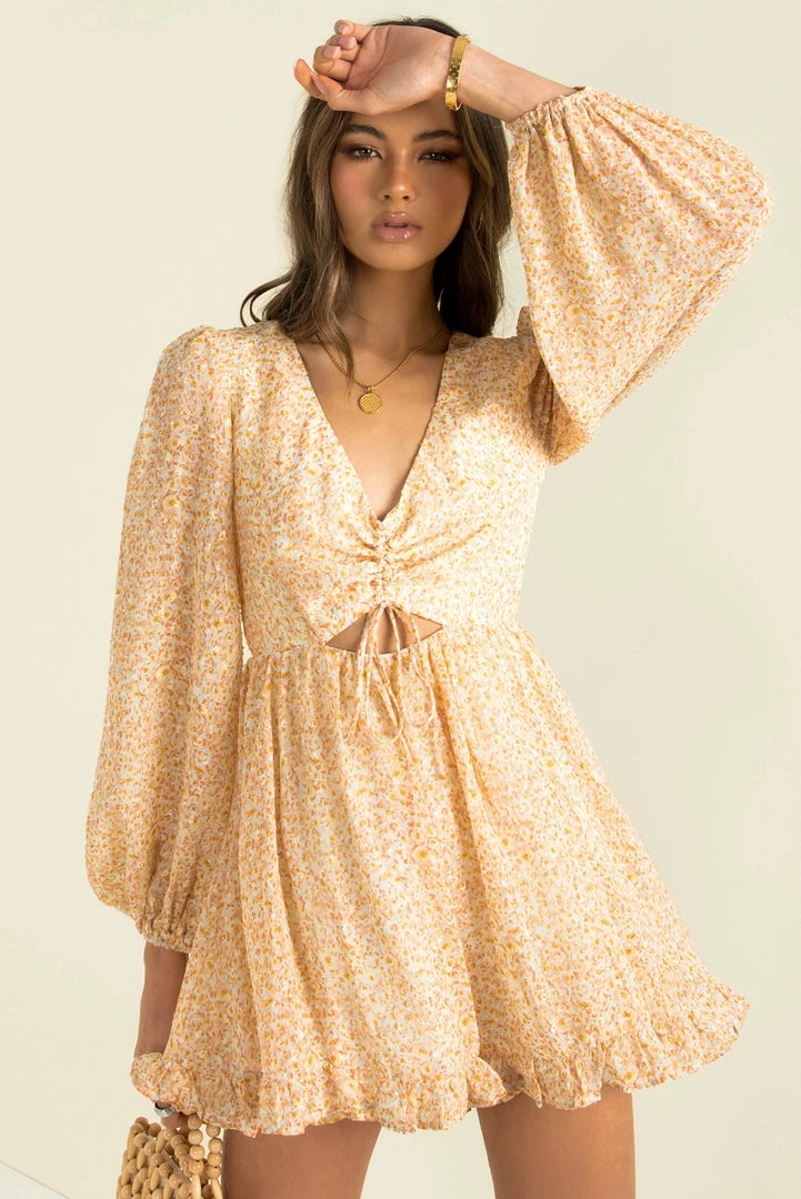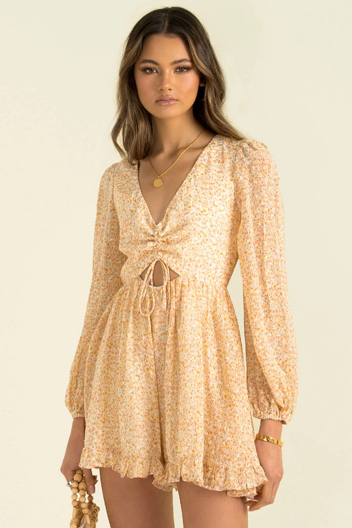 Perfect for your next night out! Our lovely Hope Playsuit is made from a shimmering fabric in a lovely orange print. She features a drawstring bust with cutout detail underneath, long semi-transperant sleeves and cute frill trim shorts. Style her with gold hoops, strappy heels and a mini bag for a stunning party look!