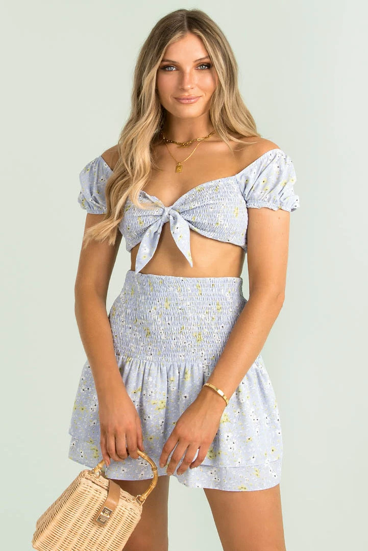Look completely adorable in our gorgeous Izzy Top! This lovely crop top is made from a shirred fabric in a pastel blue floral print. She also features elasticated short sleeves ad a tie up detail in the front. Style it with high-waisted denim or our beautiful matching Izzy Skirt!