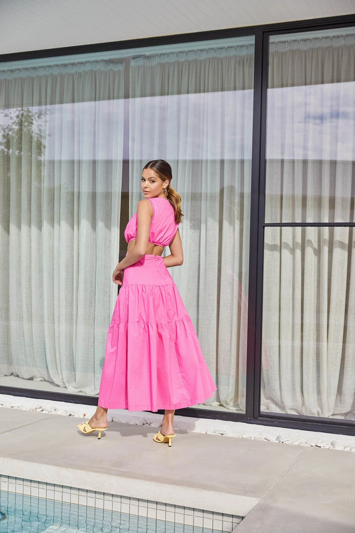 The perfect splash of colour! Our stunning Jacynta Dress is made from a high-quality fabric in Fuchsia and features a flattering v-neckline, cutouts at the waist and a mid-length skirt. Finish your look with Gold hoops earrings and contrast heels.