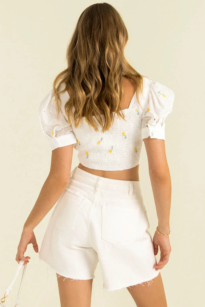 Cutouts in all the right places! Our beautiful Josie Top is a cropped style made from a lovely white anglaise fabric with a yellow floral design throughout. She features short sleeves, a ti-up detail at the bust and cute cutout details at the sides. Style her with high-waisted shorts and mules for a look that’s both feminine and cool.
