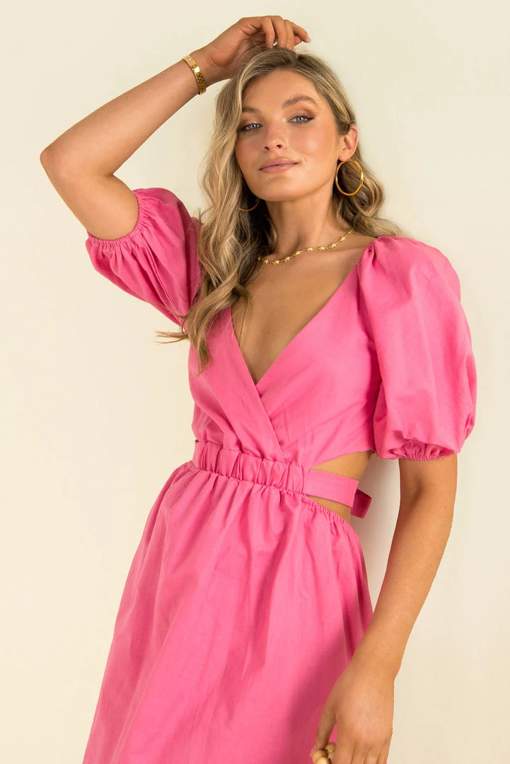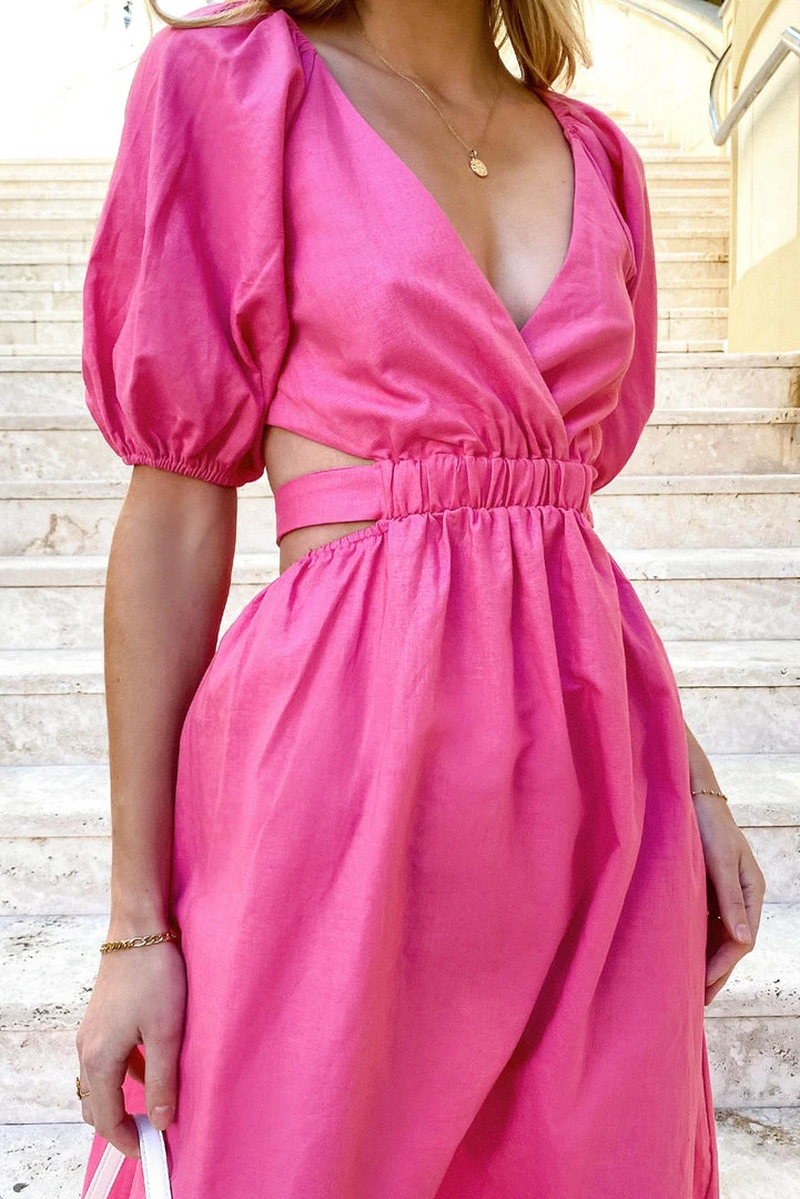 Our beautiful Julien Dress is the perfect choice for your next event. This stunning midi dress is made form a high-quality, linen fabric in hot pink. She features a crossover v-neckline, puff sleeves and a mid-length skirt. She also has a cutout at the waist and waist tie that threads through at the front and ties in the back. Finish your look with gold jewellery, a clutch and strappy heels.