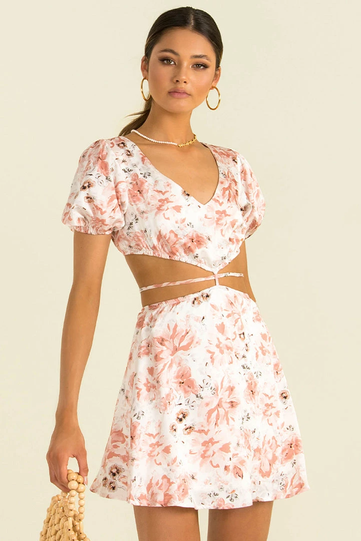 Cutouts in all the right places! Our lovely Karli Dress is made from a white fabric with a pink floral print throughout. She features the most gorgeous details; puff sleeves, cutouts at the waist with waist-tie and an A-line skirt. Style her with sandals for the day or dress her up with tan mules and a clutch.