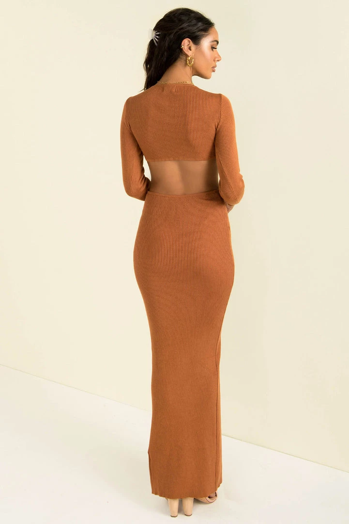Chic and elegant! Our gorgeous Katrina Dress is made from a ribbed fabric in a neutral hue. This striking maxi dress features long sleeves, a flattering V neckline, cutouts at the waist a front leg split. Style her with gold hoops, a clutch and strappy heels for your next party!