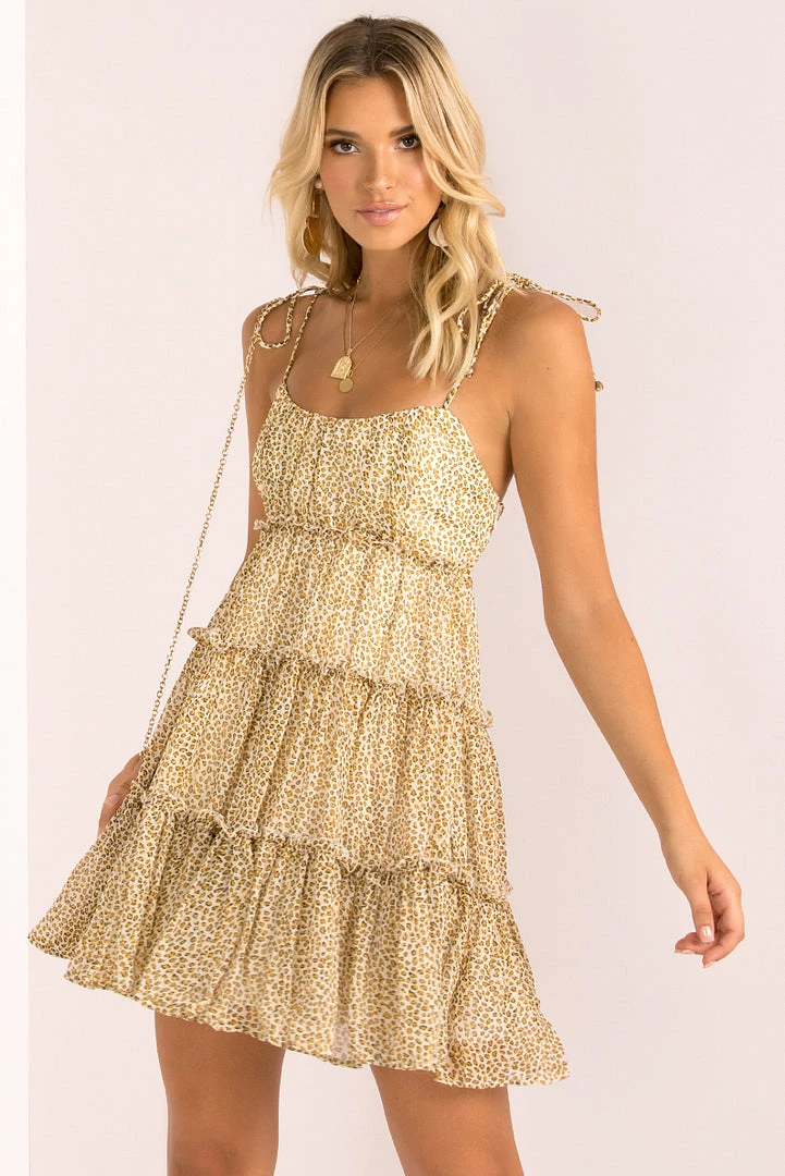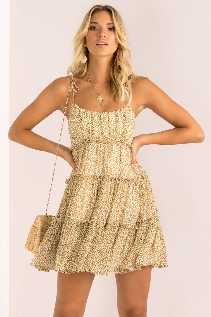 Fall in love with our gorgeous Kiara Dress! This stunning mini is made from a chiffon like fabric in a small leopard print. She features thin tie-up shoulder straps and a cute flared silhouette. Style her with gold accessories and lace-up heels for your next night out!