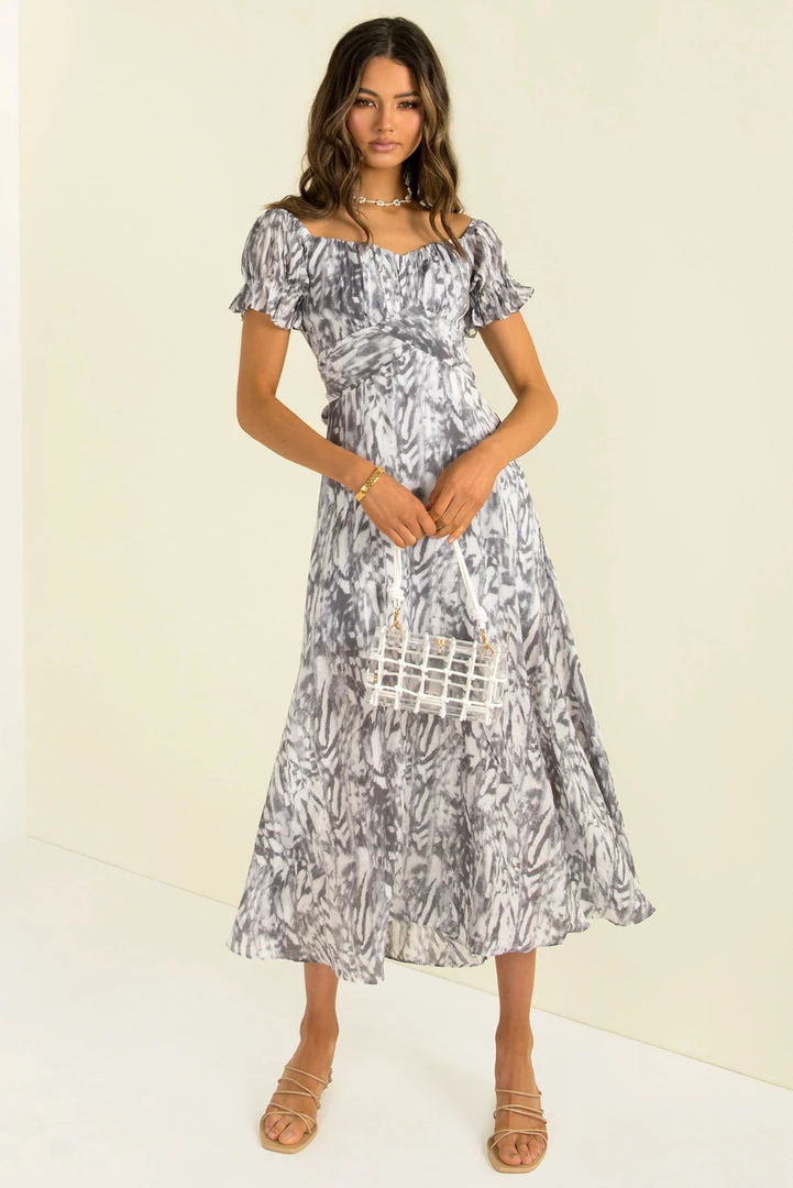 Turn heads in our stunning Kristen Dress! This off-shoulder beauty is made from a stunning fabric in a dreamy navy blue and white print. She features a fitted waist with sash that crosses over and ties in the back, and a flowing mid-length skirt. Style her with tan heels and a mini bag for your next event.