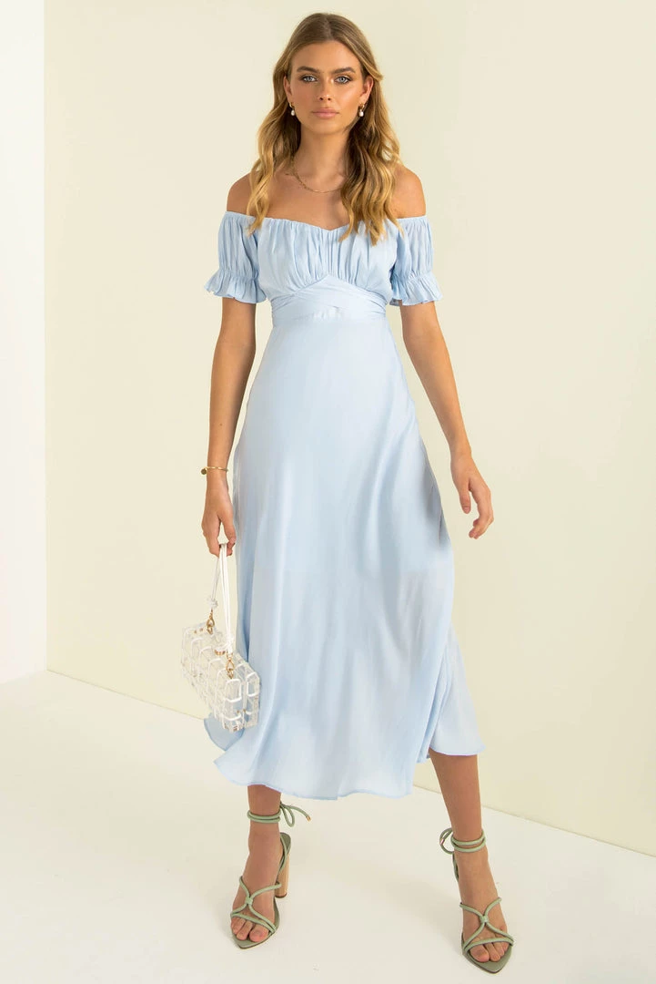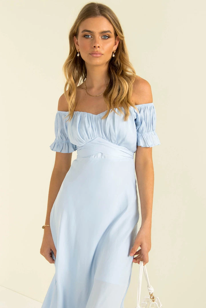 Turn heads in our stunning Kristen Dress! This off-shoulder beauty is made from a stunning fabric in a light blue hue. She features a fitted waist with sash that crosses over and ties in the back, and a flowing mid-length skirt. Style her with tan heels and a mini bag for your next event.